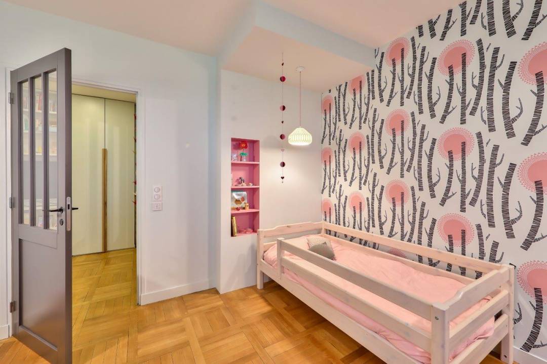 Cet appartement a été intégralement repensé en terme d'agencement et de décoration intérieure. La cuisine est devenue un bureau, les couloirs d'accès aux chambres d'enfants une salle de jeux. Le séjour accueille une cuisine intégralement réalisée sur mesure, ouverte avec un plan de travail et son jambage en marbre.