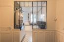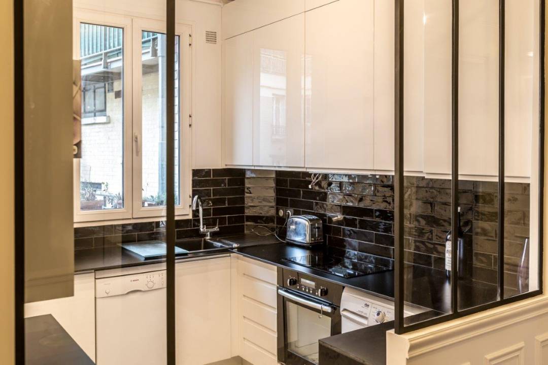 Cet appartement se joue des contrastes entre le noir et le blanc, les moulures haussmanniennes et la verrière type atelier ou encore le mat et le brillant de la cuisine. La petite cuisine étriquée s'est transformée en une belle cuisine semi ouverte avec sa grande verrière et un espace en angle, récupéré des toilettes définitivement trop grands. La gaine technique et les tuyaux se sont transformés en niche déco sur mesure.