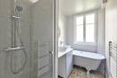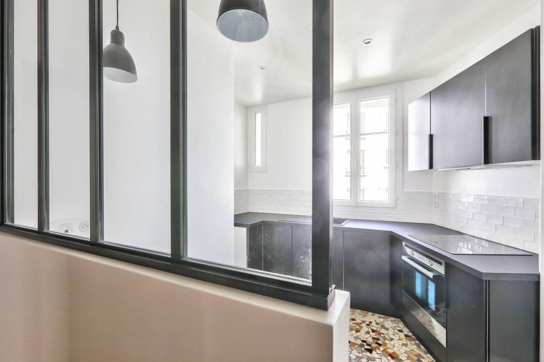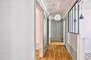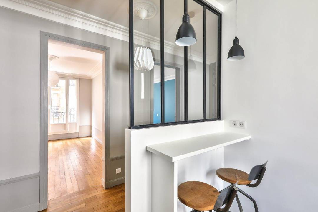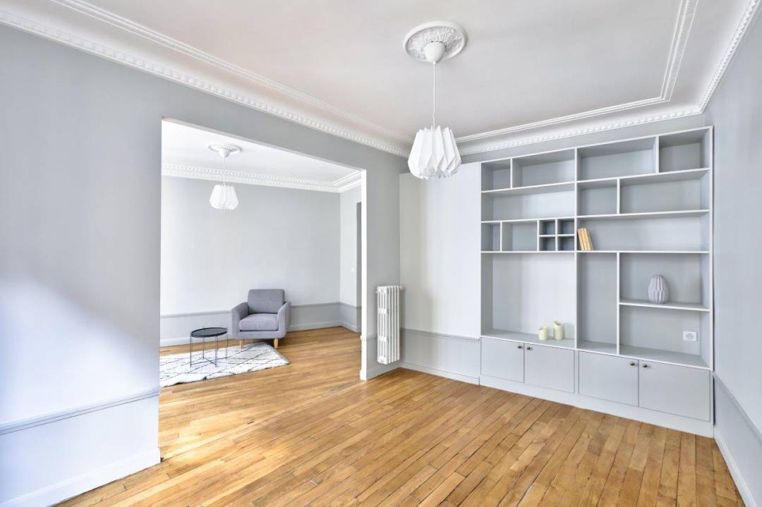 Rénovation d’un appartement pour un investissement locatif. Une décoration et un agencement qui se veulent actuels dans une enveloppe volontairement conservée « vintage » avec notamment le carrelage de la cuisine, de la salle de bain ou la baignoire sur pieds. La bibliothèque a été conçue sur mesure côté salon et a permis de créer un placard côté entrée.