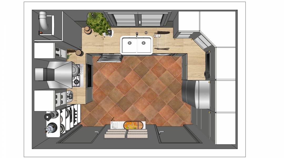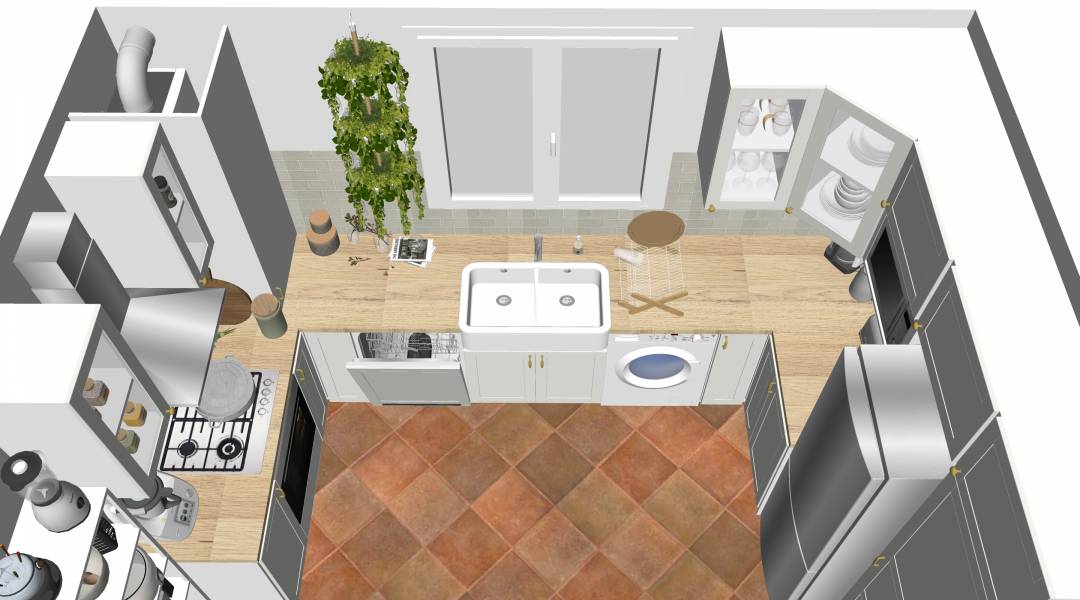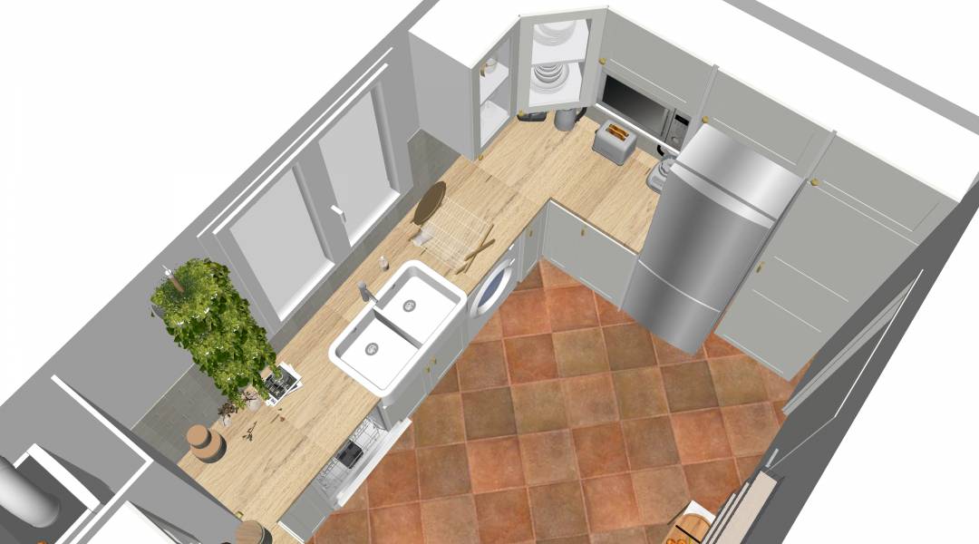 Une cuisine au style chic & campagne avec dominante de beige et de laiton. Cette cuisine toute équipée fera la joie des clients.