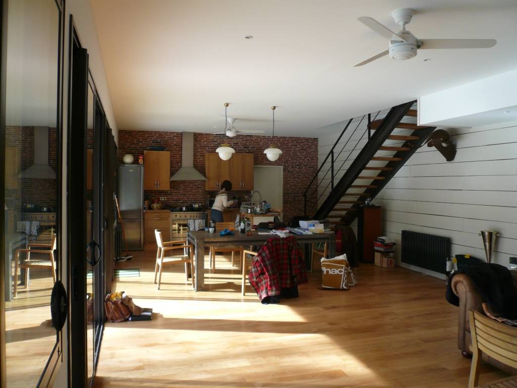 La cuisine à l’américaine s’ouvre également sur le séjour avec poêle à bois sur fond de mur de briques rouges en fond. Un escalier de métal et de bois permet d’accéder à l’étage situé au niveau de la rue pour desservir 4 chambres avec SB et WC et SE pour chaque chambre. Un appartement sur 2 niveaux est accolé à l’ensemble pour y accueillir les amis, il est accessible à chaque niveau et depuis la terrasse.