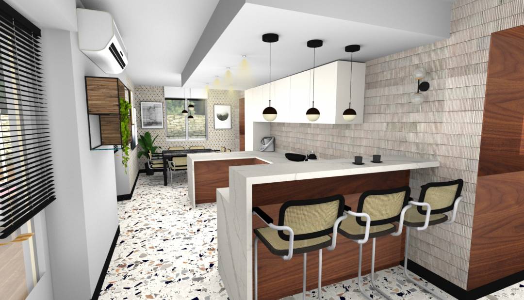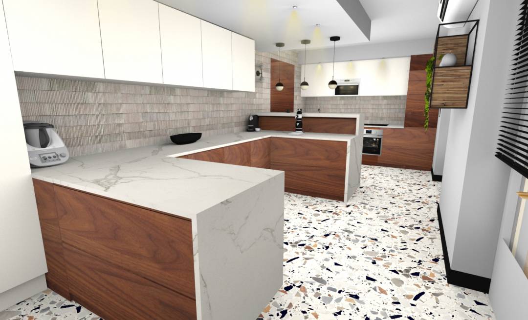 Il s'agit d'un projet en ligne de rénovation complète de la cuisine d'une maison de village ancienne en Alsace .Les jeunes propriétaires voulaient une cuisine moderne et fonctionnelle . D'une superficie de 29m2 et avec 3 fenêtres et baies vitrées donnant sur un jardin plein ouest cette pièce a beaucoup de points forts . D'un autre côté sa forme tout en longueur 9x3 m était l'un des principaux points négatifs . Pour des raisons techniques il fallait garder le point d'eau ainsi que les plaques au même endroit , et il fallait également beaucoup de plans de travail de rangements et un coin pur positionner machine à café à bière et robot cuisine . De part sa longueur , la pièce permettait l'aménagement de plusisuers espaces définis . J'ai donc aménagé un espace salle à manger dans le fond , au milieu la zone en U qui sert à la prépartion , au rangement , ainsi que le bar avec tabourets qui permet de dissimuler les machines à café et bière . et enfin à l'entrée la zone de lavage de cuisson , réfrégirateur . Le carrelage trés actuel le bois des meubles et les plans de travail en marbre calacata oro signent la modernité affirmée de cette réalisation .