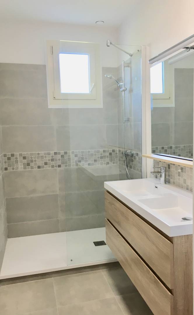 Le choix d'un décors dans la douche et au niveau de la crédence de la vasque permet de donner un peu de mouvement à l'ensemble afin qu'il ne soit pas trop fade.
