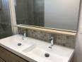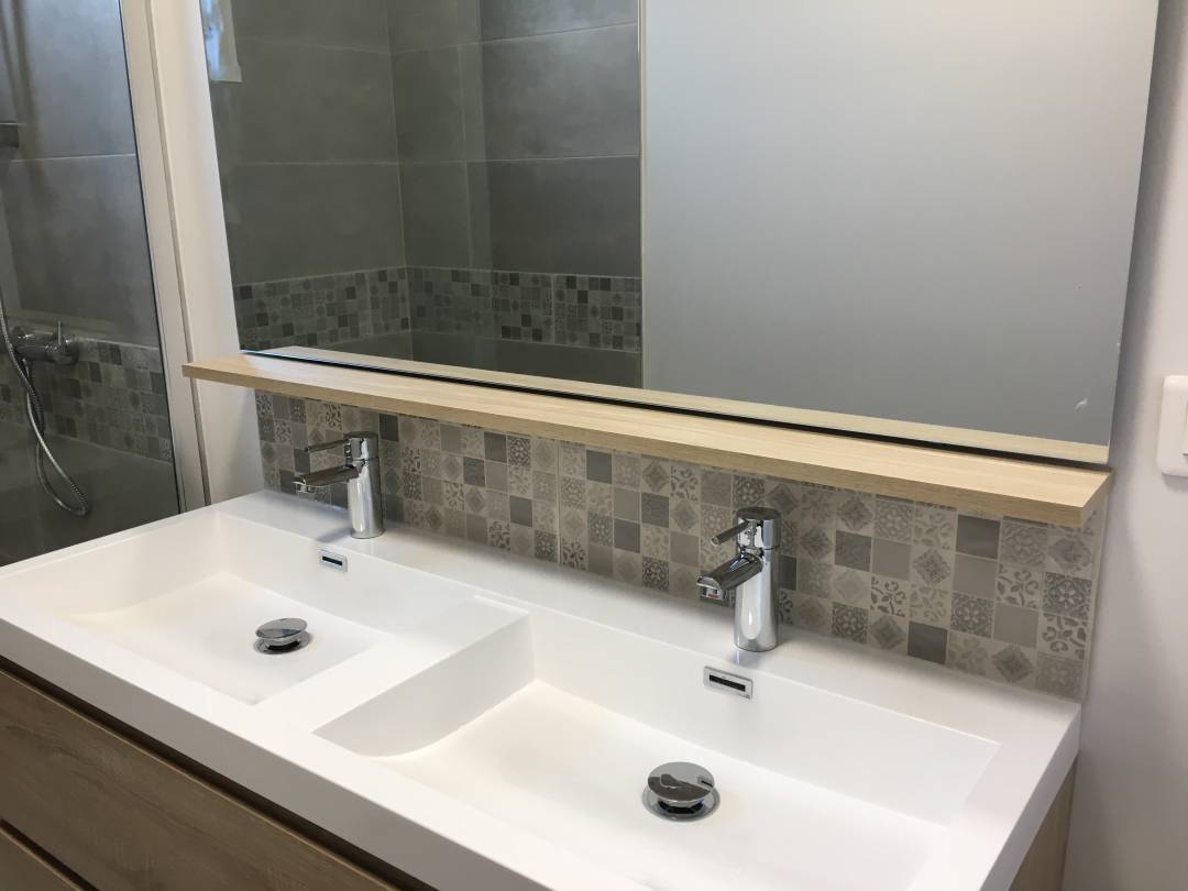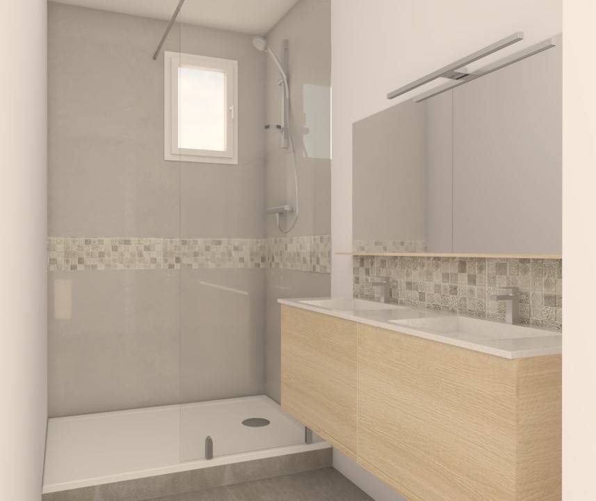 Rénovation d'une salle de bain avec le souhait de remplacer la baignoire par une douche spacieuse ainsi que l'ajout d'un meuble avec double vasque. Notre mission pour ce projet a été l'étude du projet contenant l'élaboration d'un cahier des charges par la prise de contact avec l'espace, proposition d'aménagement et décoration via des supports comme une planche d'ambiance et une perspective 3D, le suivi des travaux.