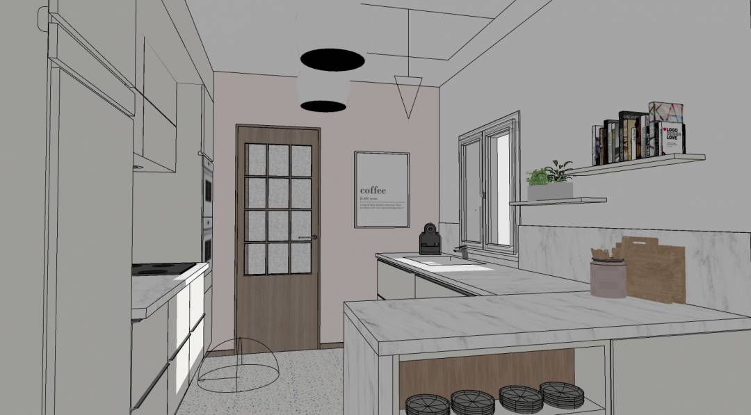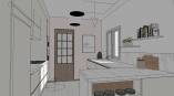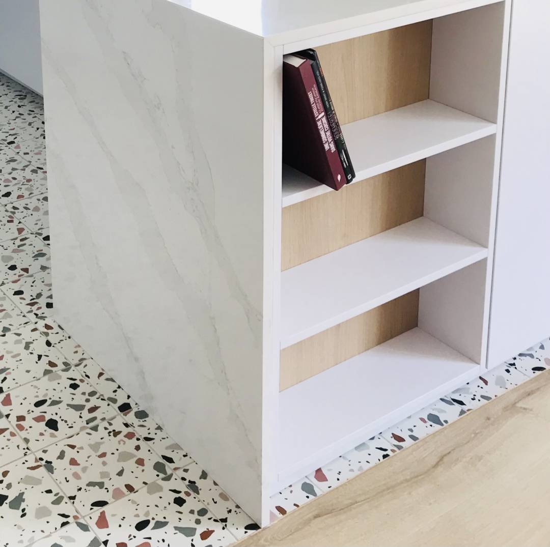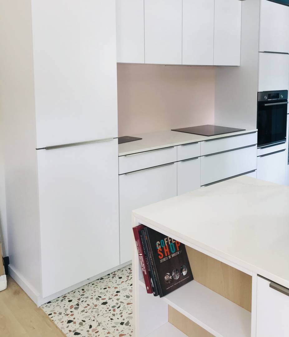 Choix est fait de moderniser l'ensemble et l'éclaircir en propossant une palette douce et claire avec des meubles blancs, un carrelage façon terrazzo et un plan de travail en quartz.