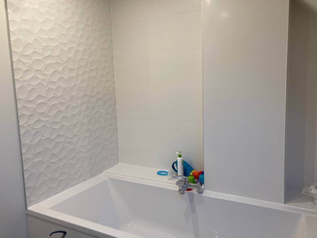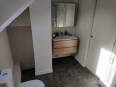 Le choix final s'est porté sur un sol souple en dalles pvc noir pour le chic, des sanitaires blancs pour ne pas donner une sensation de d'espace trop petit, du carrelage mural blanc en 30x60 pour allonger et avec motifs pour donner du mouvement, le tout réchauffé par un meuble vasque en bois réhaussé d'une armoire à glace.