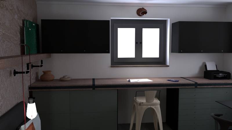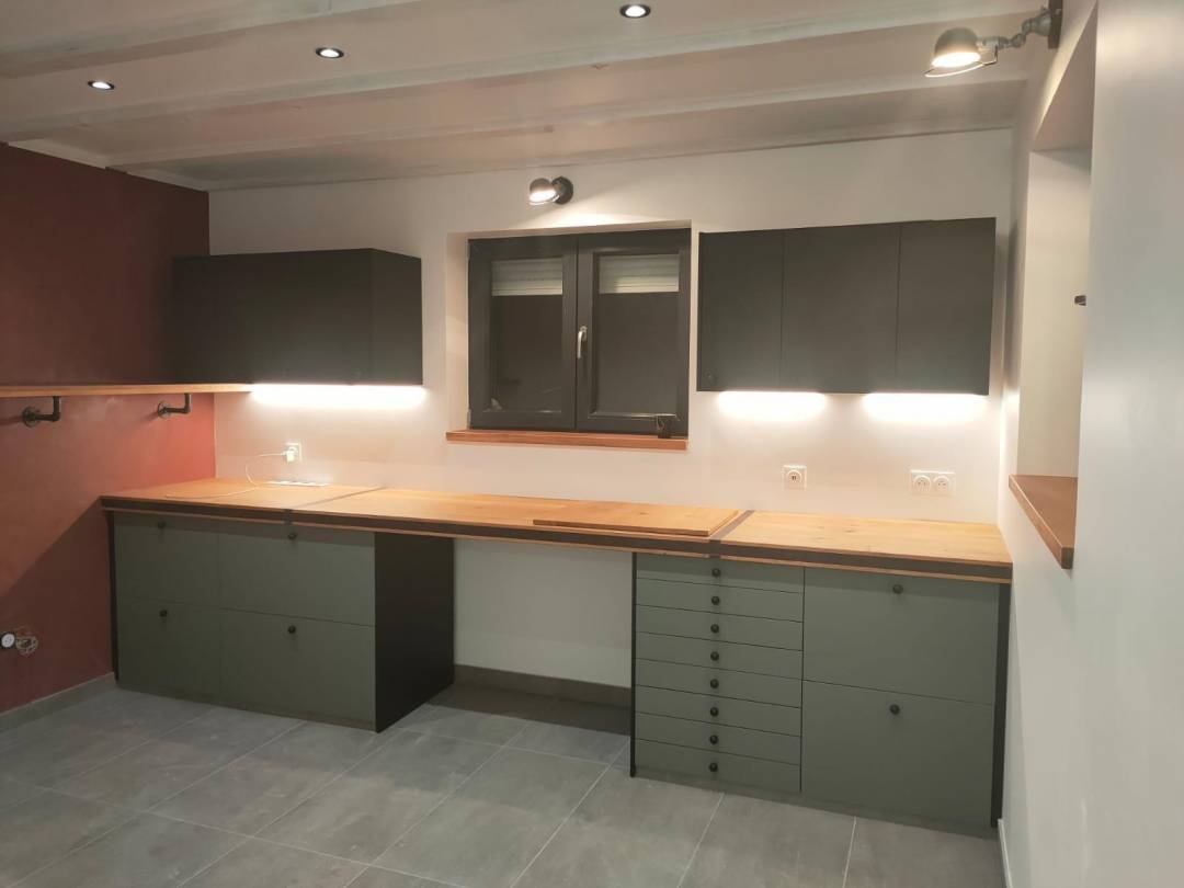 Cette dépendance avait pour but d’accueillir un garage, un bureau style industriel et une salle de douche. L’espace bureau devait pouvait accueillir des activités administratives, des activités créatives et pouvoir servir occasionnellement de chambre d’amis. Il s’agissait de pouvoir pratiquer des activités de création nécessitant un plan de travail important pour utiliser des outils et machines, pouvoir passer d’une activité de bureau à une activité créative facilement, disposer de nombreux rangements, avoir un espace lecture et disposer d’un espace de couchage au besoin. Notre cliente souhaitait conférer un esprit « atelier » à cet espace…