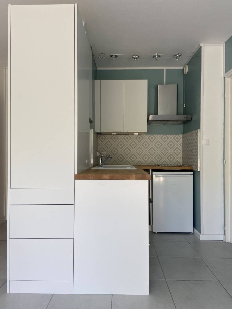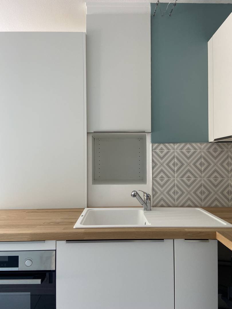 L’objectif etait de moderniser l’appartement, d’adapter les espaces pour qu’ils soient fonctionnels en y apportant des touches de couleurs. Le tout dans un style zen, avec des couleurs clairs et pastels. Pour cela l’idée est de: - aménager la cuisine pour la rendre plus fonctionnelle avec un plan de travail utile pour cuisiner, - aménager la salle de bain en changeant la baignoire par une douche et en intégrant un lave linge, - refaire le sol de tout l’appartement avec du carrelage, - changer le mobilier par du mobilier plus moderne et fonctionnel qui s’accorde au style de l’appartement en gardant la table à manger, - remplacer les portes du placard de l’entrée, - repeindre les murs et plafond avec les couleurs choisies.
