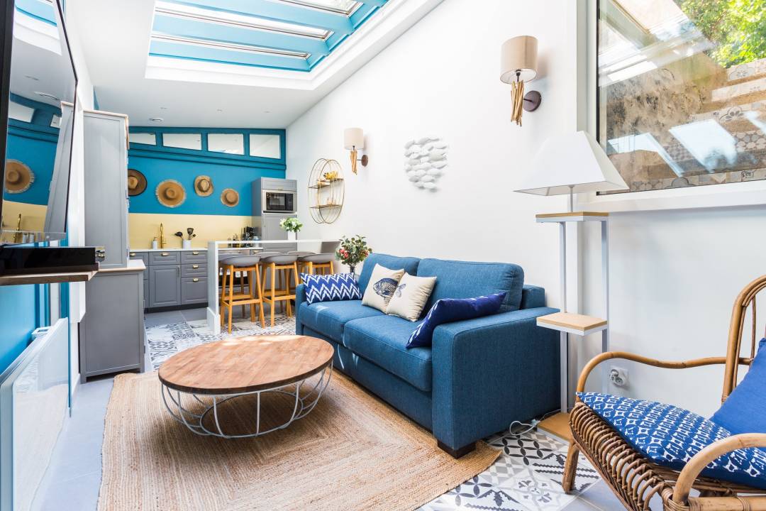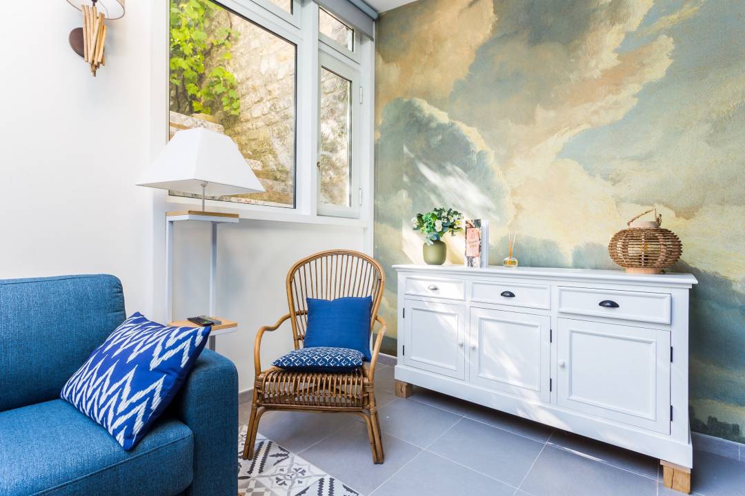 APPARTEMENT 55M2 RUE DE PATAY PARIS Rénovation, ameublement et agencement de A à Z. L’ensemble du chantier a été réalisé par nos soins du gros oeuvre à la mise en place de la petite déco. Brief: transformation d’un ancien bureau sur jardin intérieur en rez de chaussée d’un blanc immaculé agrémenté d’une belle verrière riche en lumière mais vétuste en appartement de charme pour un couple de cadres new-yorkais en quête d’un petit pied à terre parisien.