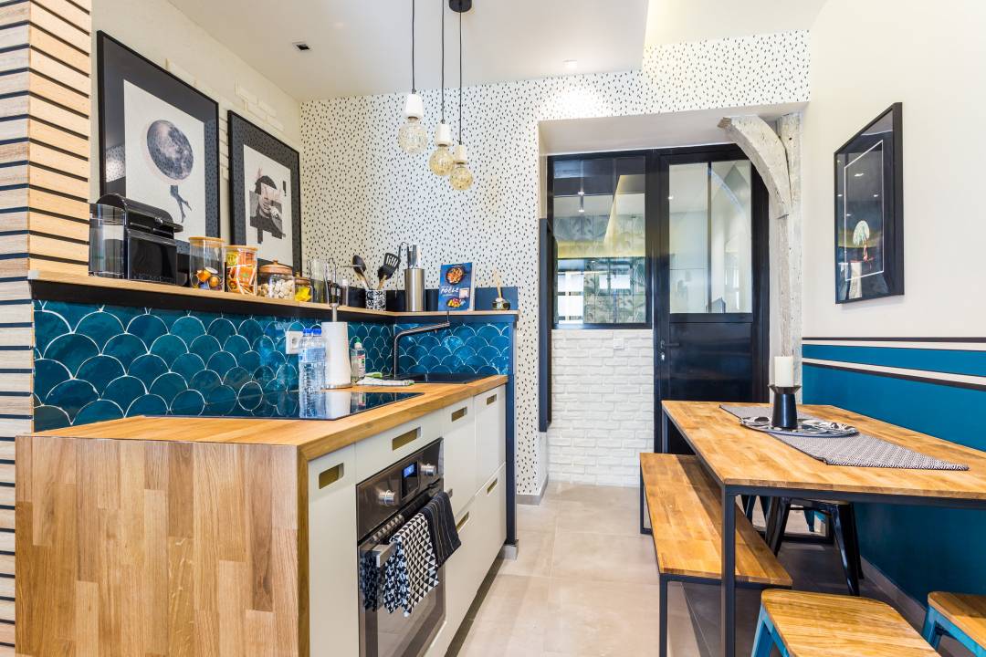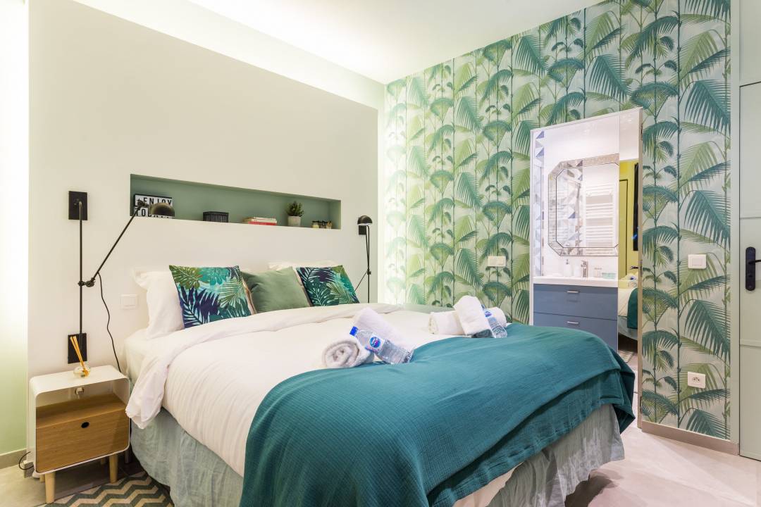APPARTEMENT 90M2 RUE DE CLERY Rénovation, ameublement et agencement de A à Z. L’ensemble du chantier a été réalisé par nos soins du gros oeuvre à la mise en place de la petite déco. Brief: transformation d’une ancienne boutique sur rue en location saisonnière pour 8 personnes. Comment métamorphoser une ancien local commercial sur rue dénué de tout charme et tombant en lambeaux en charmante petite location saisonnière parisienne dédiée à 8 convives dans un esprit moderne mais toujours ludique et bien pensé? En cloisonnant astucieusement grâce aux verrières, grâce aux papiers peints et peintures, précieux alliés des mise en âme de nos lieux et en jouant sur les volumes. Délai: 1 mois et demi. Surface: 90m2