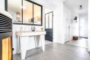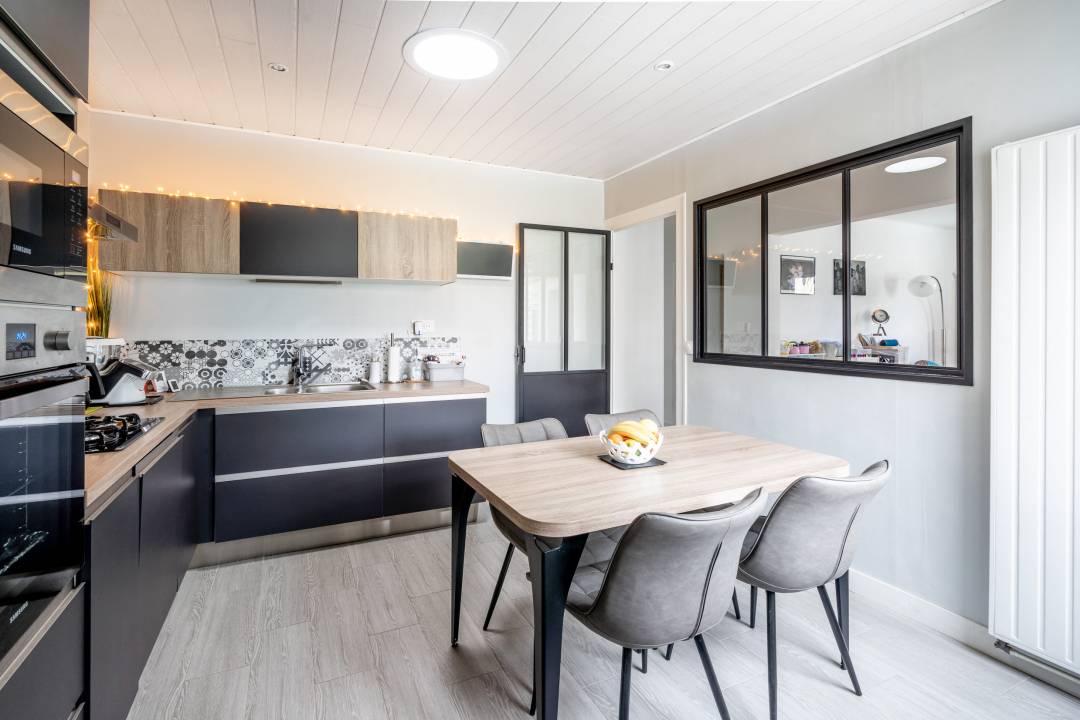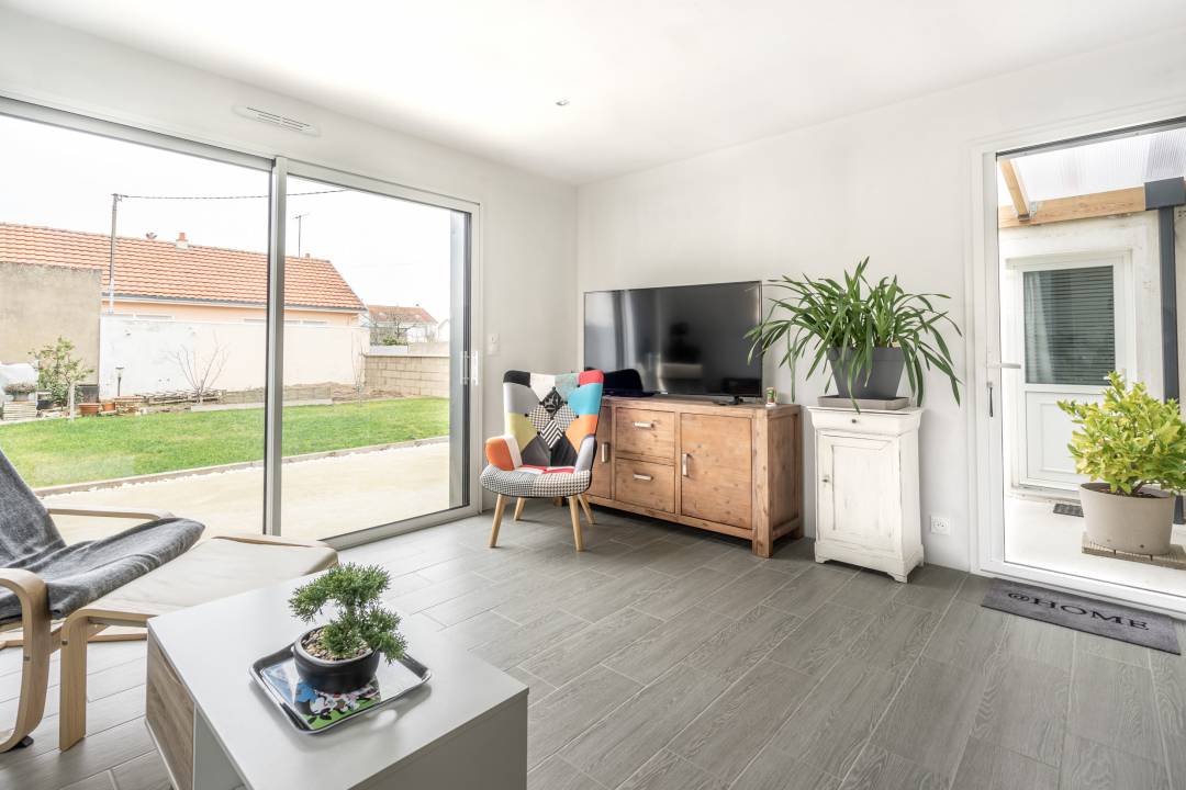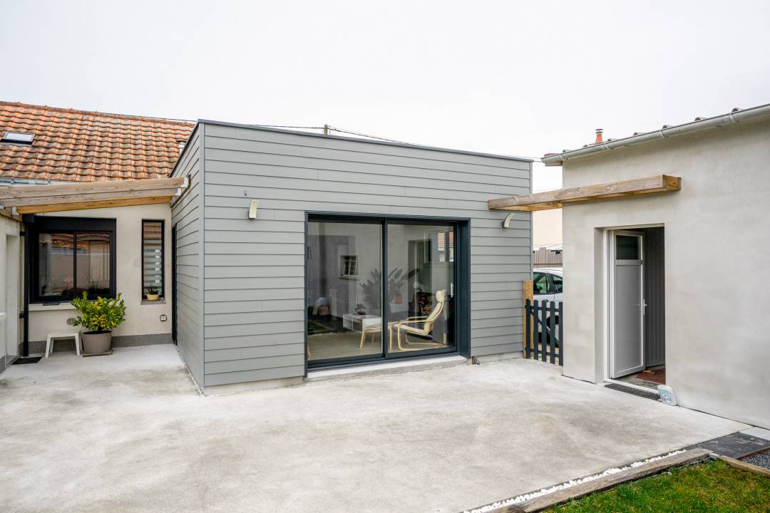 Projet d'extension ossature bois d'une maison, Extension toit plat avec finition en bardage fibro ciment. Modification du garage existant. Création d'une terrasse. Modification de l'agencement intérieur et des ouvertures.