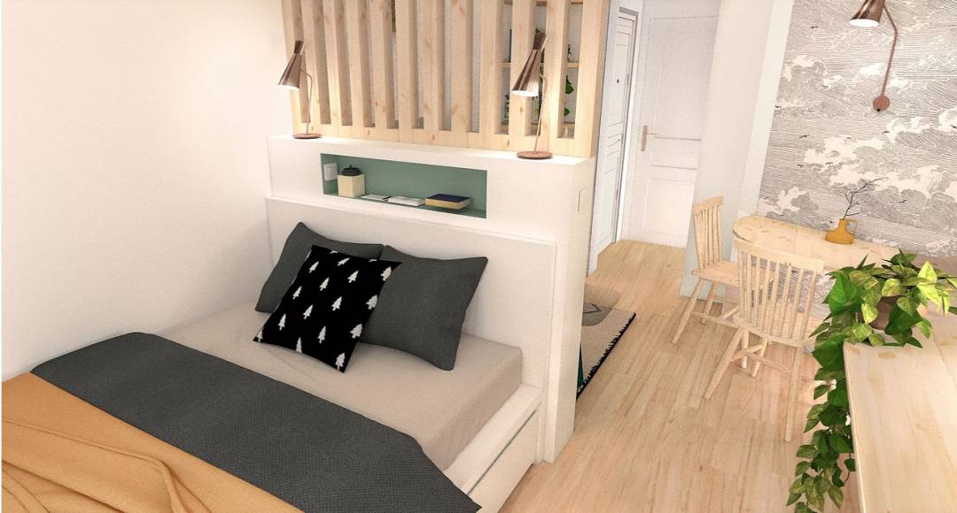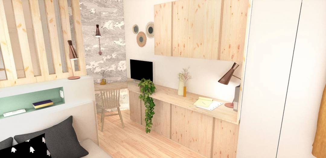 Avec tout ses murs porteurs et ses pièces étroites, il n'était pas facile pour les propriétaires du lieu d'aménager un nid douillet pour leurs futurs locataires. Nous avons donc imaginé ensemble la nouvelle disposition de ce 22m2, avec comme objectif de définir un coin nuit, d'avoir un maximum de luminosité, et également de multiplier les rangements. ​