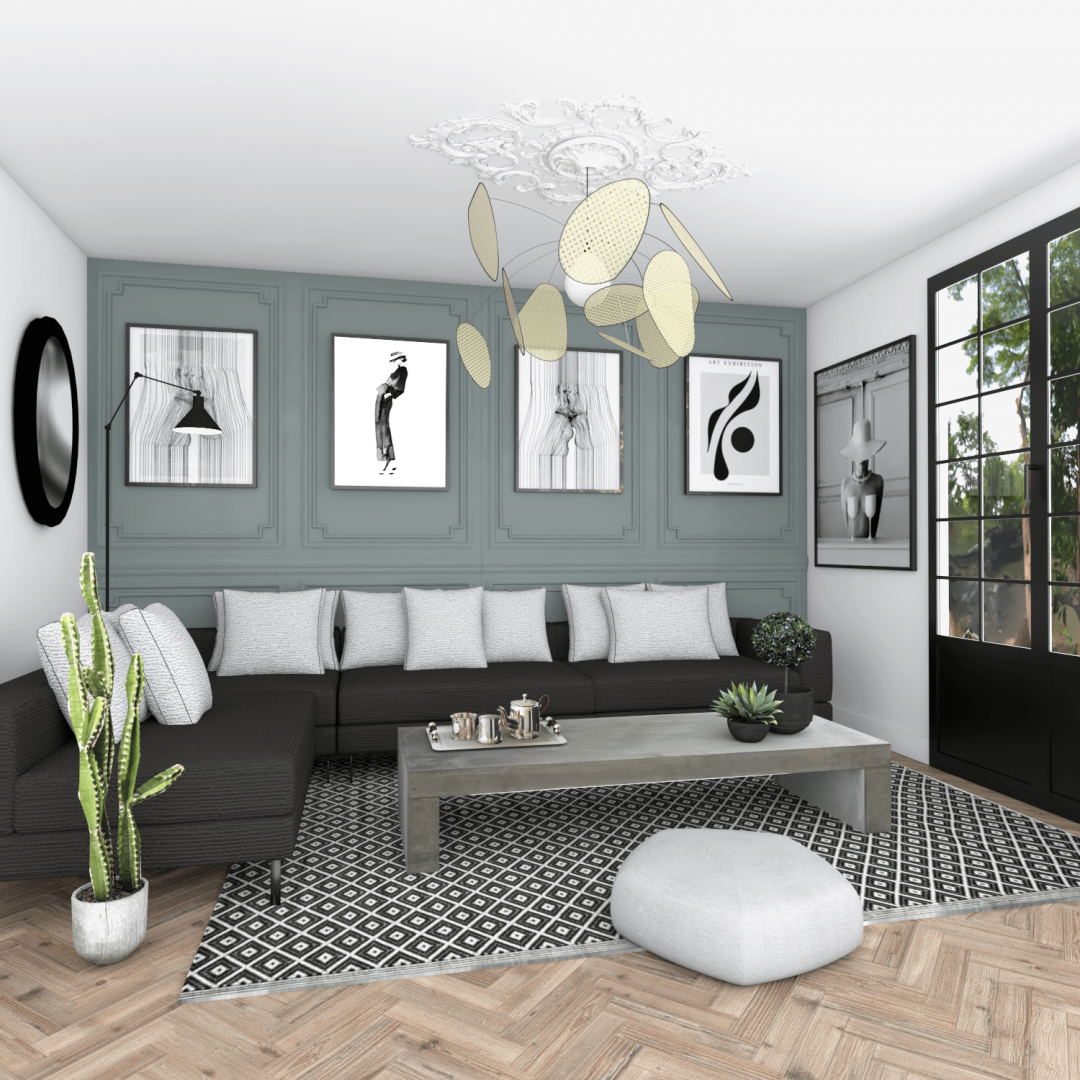 LE BRIEF : Repenser l'aménagement et la décoration du salon pour accentuer son côté convivial avec pour pièce maîtresse un immense canapé d’angle. LA PRESTATION : BOOK DÉCO & AMÉNAGEMENT + VUE 3D PHOTO-RÉALISTE LE RÉSULTAT : Une ambiance douce et romantique à laquelle nous avons mêlé des notes "arty" avec de très belles affiches encadrées. La couleur principale : un gris vert «sauge» est soutenue par différentes nuances de noir. Un tapis noir et blanc aux motifs géométriques laissera apparaître un parquet chevron aux teintes bois clair. Une suspension très design prend place au centre de la pièce et de belles portes vitrées style «atelier» ouvrent sur un grand jardin arboré.
