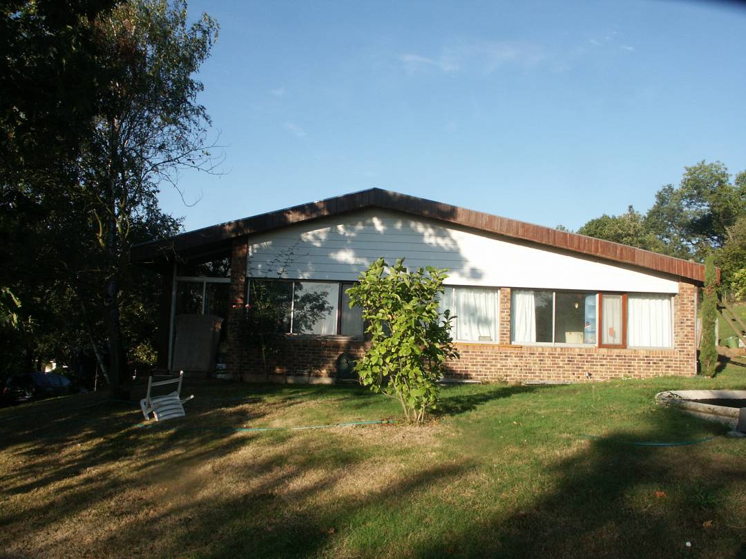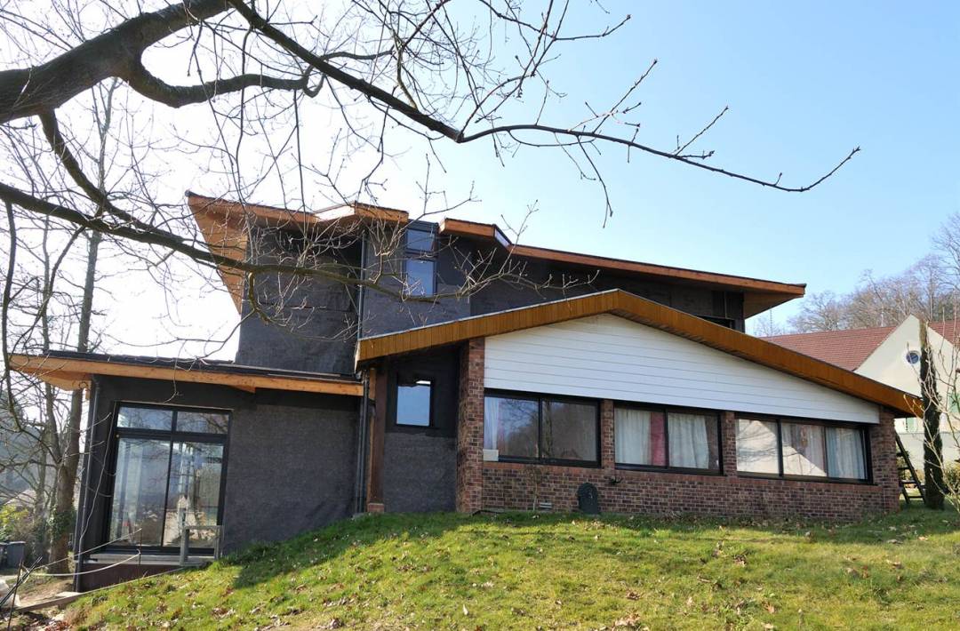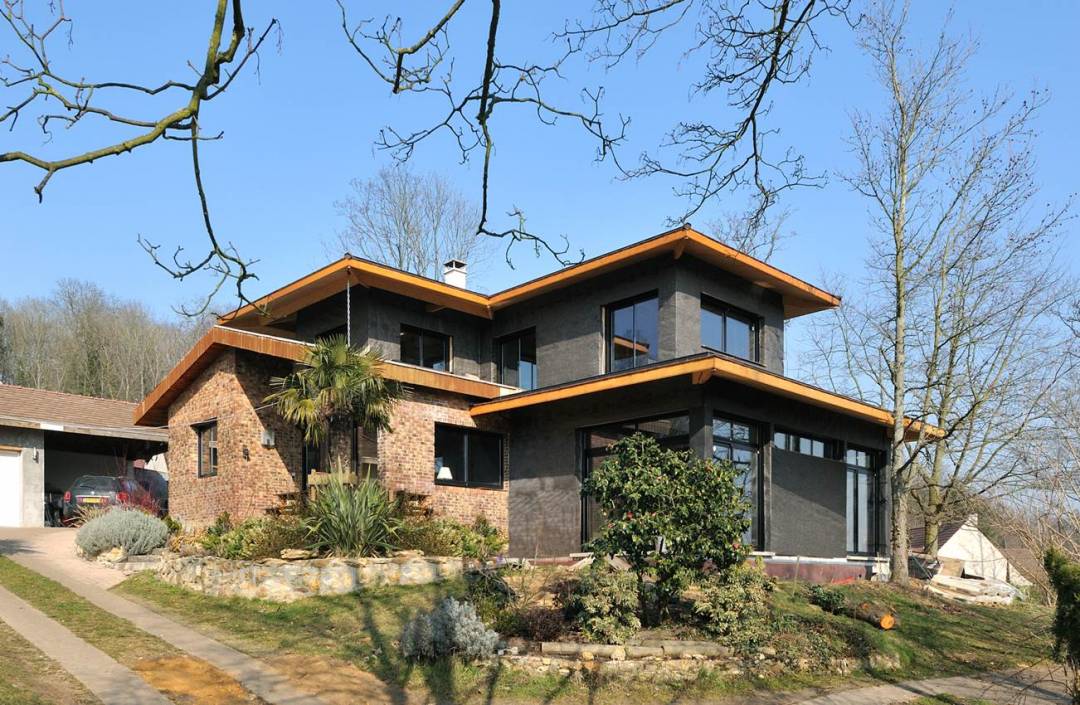 Les photos avant travaux témoignent d'une construction de plain pied en ossature bois. L'extension et la surélévation de la construction d'origine permettent aux occupants de profiter pleinement de la vue sur le centre du village et d'accroître leur séjour. Le jeu des toitures comportant de forts débords de toit affirme le caractère contemporain du projet.