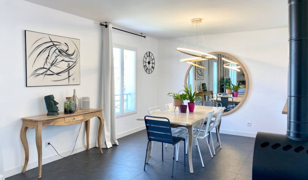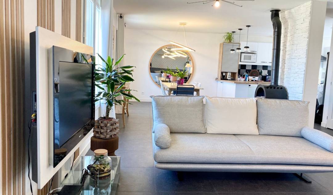 Rénovation complète pour cette pièce de vie qui manquait de clarté Lorsque Sandra et Kevin ont visité cette maison, ils ont eu un coup de coeur pour la décoration. Mais très vite après avoir emménagés, ils ont souffert du manque de luminosité. Leur pièce de vie exposé Nord avec un sol noir et du murs peints en gris anthracite manquait cruellement de lumière. Ils ont fait appel à WherDeco pour gagner en clarté et avoir un intérieur très naturel et épuré. WherDeco leur a proposé de repasser l'ensemble des murs sur une base blanche sauf un des pans de mur du salon et d'utiliser le chêne massif comme fil conducteur et ramener clarté et chaleur.