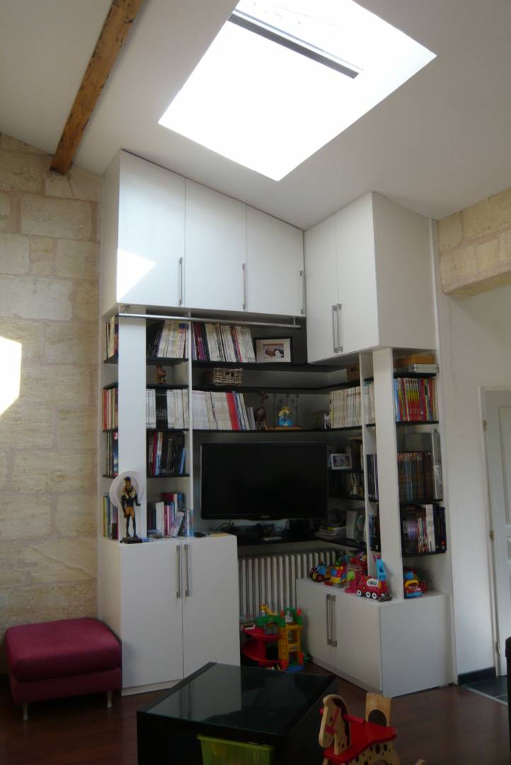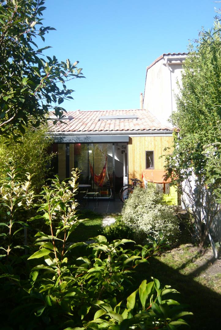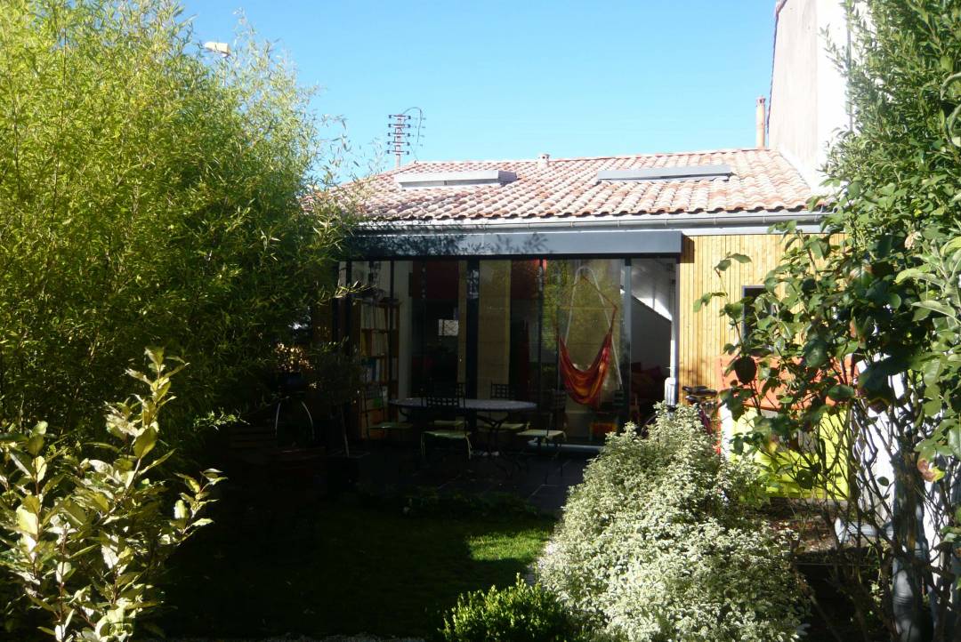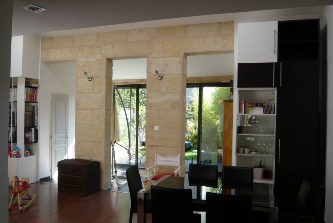Rénovation intérieure d'une échoppe talençaise et aménagement des espaces verts. Cette rénovation intérieure a permis de mettre en valeur les atouts de cette échoppe traditionnelle(pierres bordelaises apparentes et grand volume intérieur sous rampant, tout en répondant aux exigences d'un mode de vie contemporain ( lumière et fluidité des espaces. La maison s'ouvre largement en fond de parcelle sur un jardin paysager et lumineux.