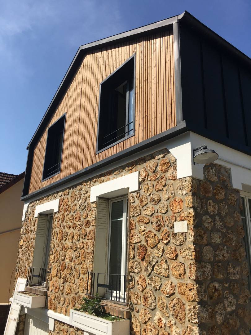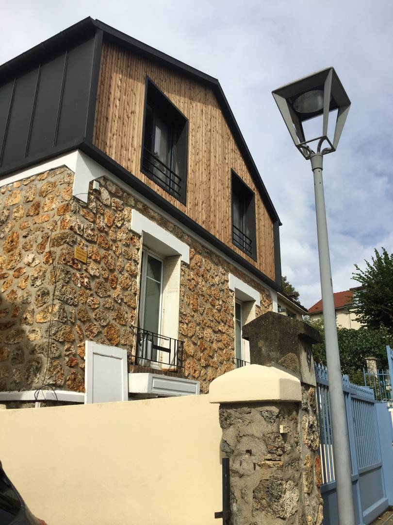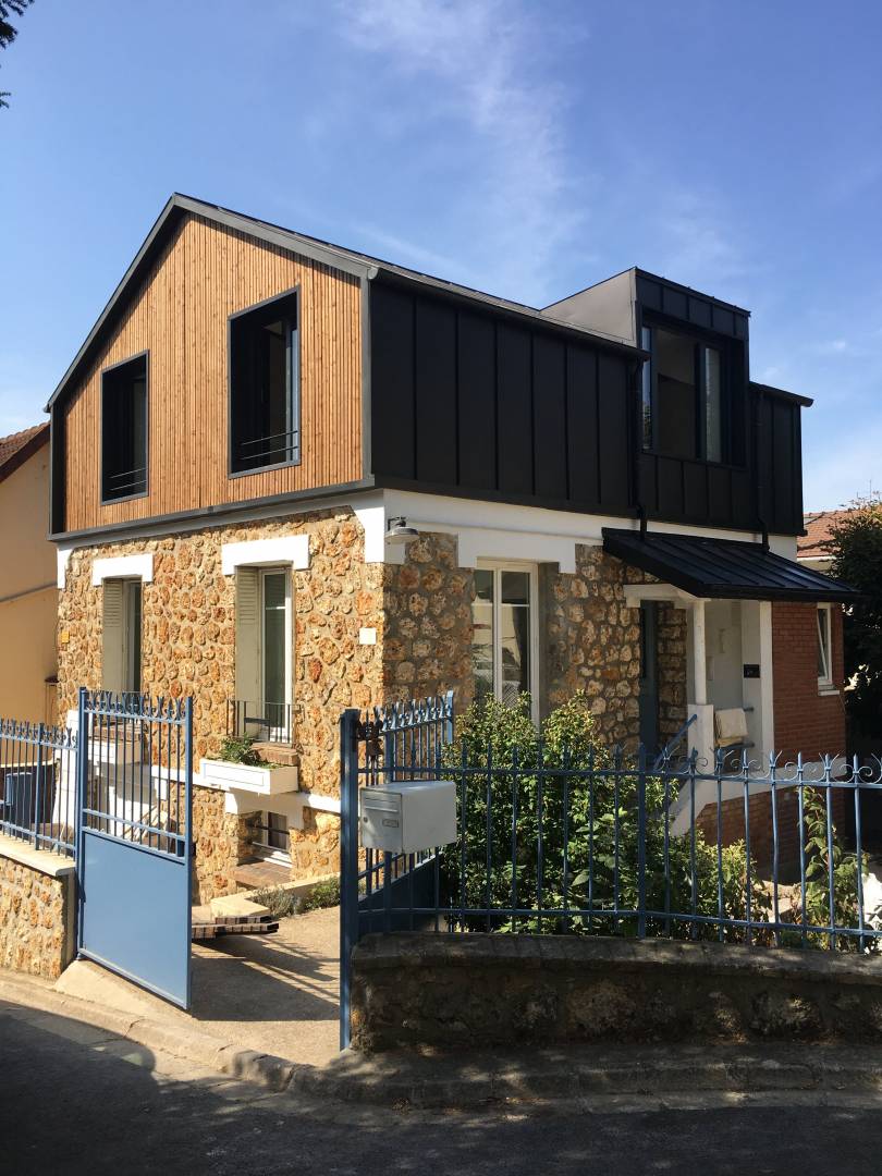 Le projet a consisté à déposer les combles existantes afin de surélever la maison et créer un étage. Le parti pris a été de donner à la surélévation une expression contemporaine afin de créer un dialogue avec la maison existante ancienne en meulière. Ce dialogue permet de mettre en avant le caractère d’époque de la maison. L’intérieur a été entièrement rénové afin de répondre aux besoins d’une famille avec enfants.