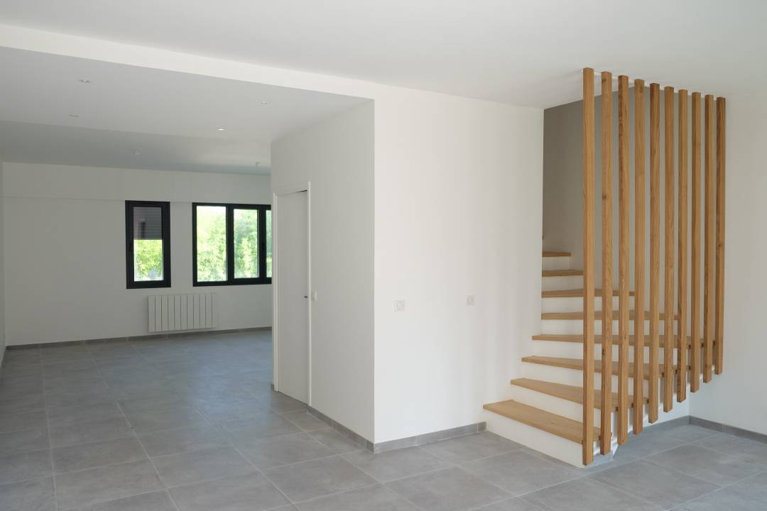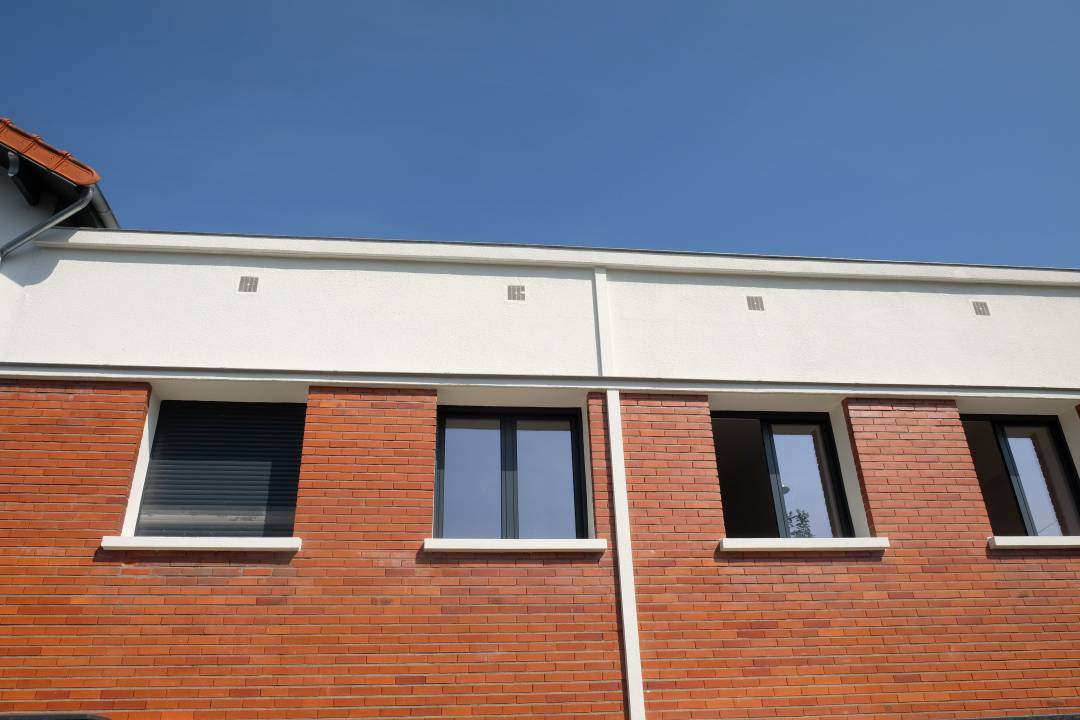 Transformer un immeuble de bureaux et commerce au rdc en deux maisons mitoyennes. Pour assurer l'intimité des logements, une clôture a été créée alignée à la rue afin d'offrir à chaque logement un petit jardin à l'avant. L'intention architecturale était de conserver l'esthétique générale de l'immeuble - à savoir la brique en façade et les lignes horizontales - tout en donnant à l'ensemble un caractère plus contemporain.
