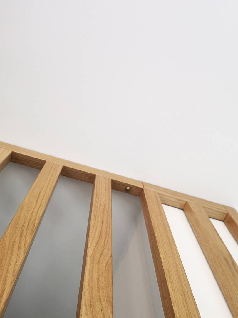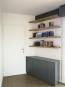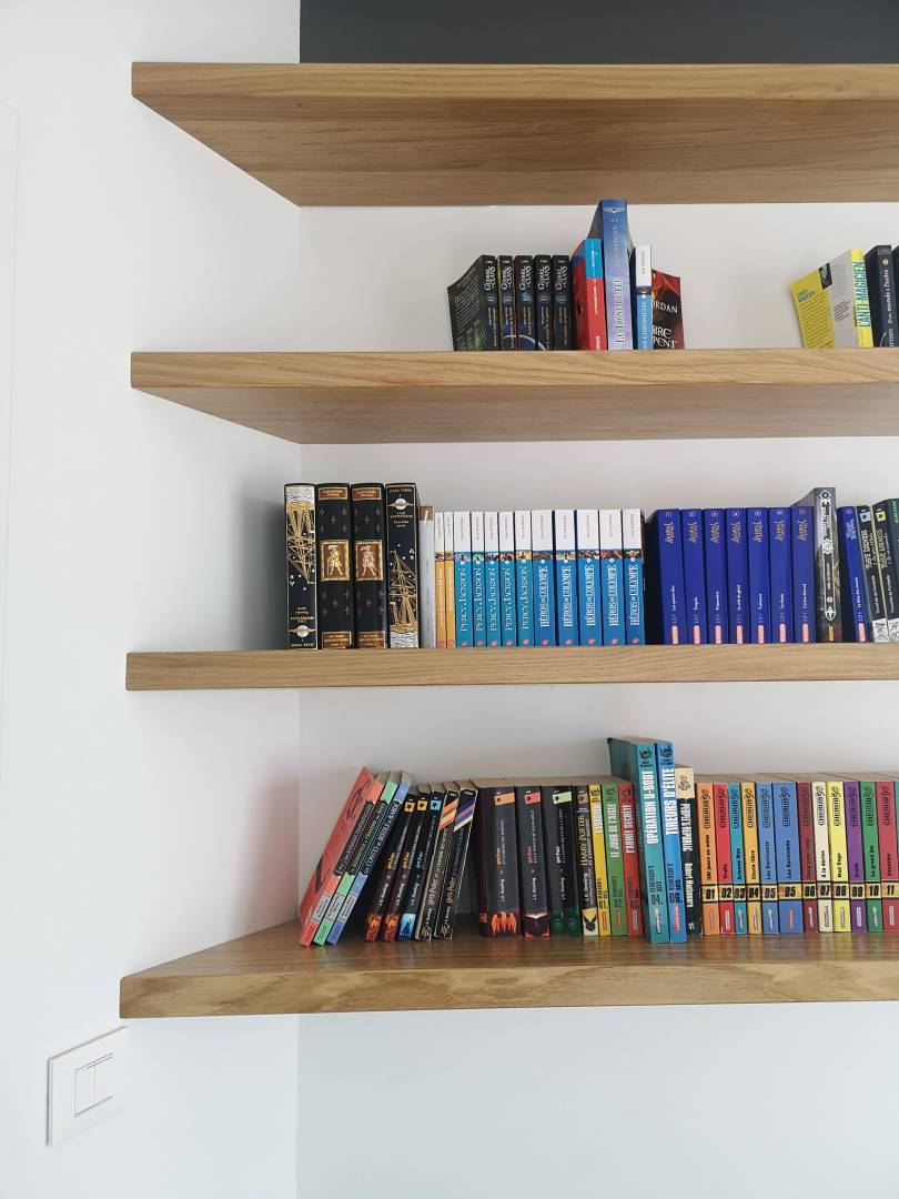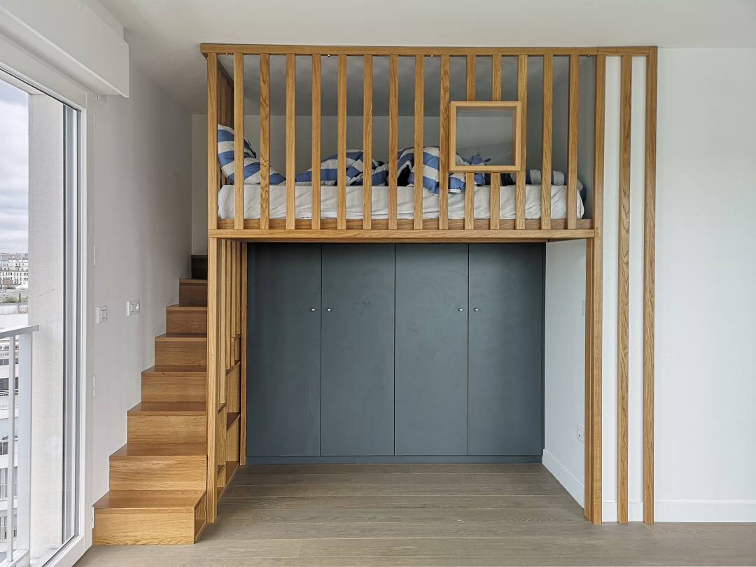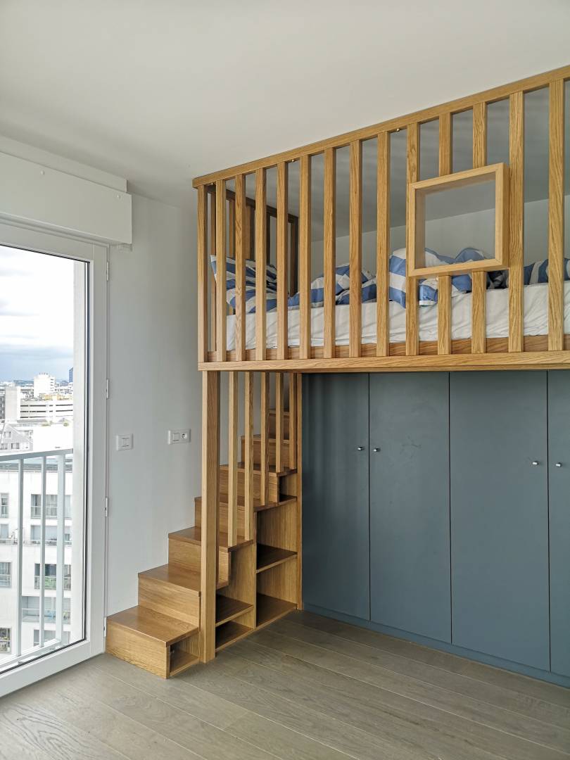 Le projet a consisté à rénover la chambre d'un enfant de 12 ans. Une mezzanine a été dessinée et créée afin de proposer un dressing au sol et un couchage en hauteur. Fabriquée à l'aide de tasseaux en chêne massif, cette mezzanine a été imaginée comme une cabane. Une niche, sécurisée avec un verre sécurit, permet à l'enfant de poser un livre, un verre d'eau etc... Des rangements fermés et des étagères en chêne, avec fixations invisibles, permettent à l'adolescent d'exposer sa collection de livres.