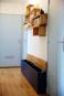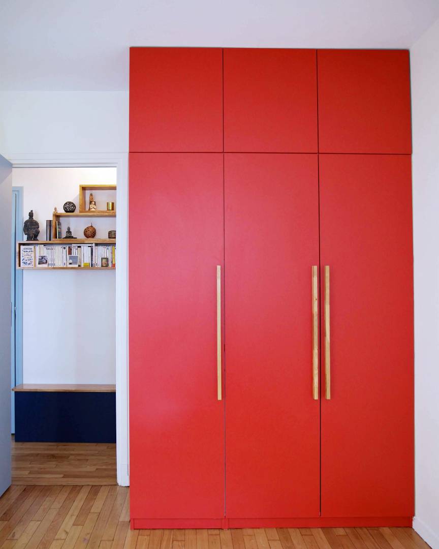 Le projet a consisté à réaménager la totalité de l’appartement. La plus grande modification a été de déposer la cloison entre la cuisine et le séjour. Ainsi, la pièce à vivre, avec cuisine ouverte, est plus lumineuse grâce aux deux ouvertures. Des meubles viennent décorer les espaces. Les claustras en bois délimitent l’entrée et la cuisine. La couleur bleue est à l’honneur dans l’appartement. Les chambres colorées sont aménagées et optimisées avec des rangements toute hauteur sur-mesure.