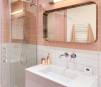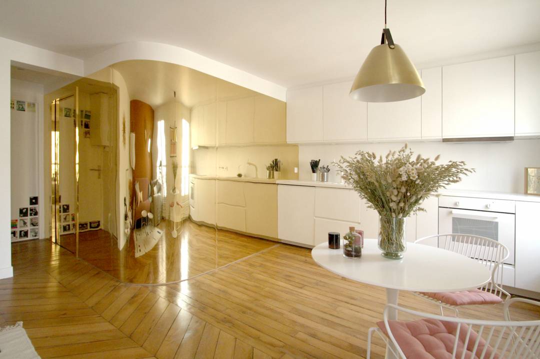 Aménager l'appartement en décloisonnant afin de profiter d'une grande pièce de vie La contrainte du mur porteur scindant l'espace en deux, pousse à réunir les fonctions entrées, wc et chambre dans la partie la plus étroite de l'appartement, libérant ainsi la plus grande partie de l’espace pour créer une pièce de vie Le projet se dessine ainsi par une courbe au centre de l'appartement. Revêtue d'un placage miroir accentuant ainsi la lumière présente grâce aux 2 fenêtres de la pièce de vie. Elle dissimule la salle de bain et conduit de l’espace nuit à l’espace jour Pour accentuer l'effet de profondeur dans le salon, une teinte chaude et un miroir Gold sont retenus La cuisine se veut discrète afin de laisser rayonner la courbe. Elle est épurée, poignées intégrées, évier, plan de travail et robinet blanc jusqu’à la crédence qui disparaît totalement L’histoire existante du lieu est présente, le parquet ancien a pu être rénové, mis en valeur, les murs plafond non redressés viennent complétés l’objet crée dans le salon