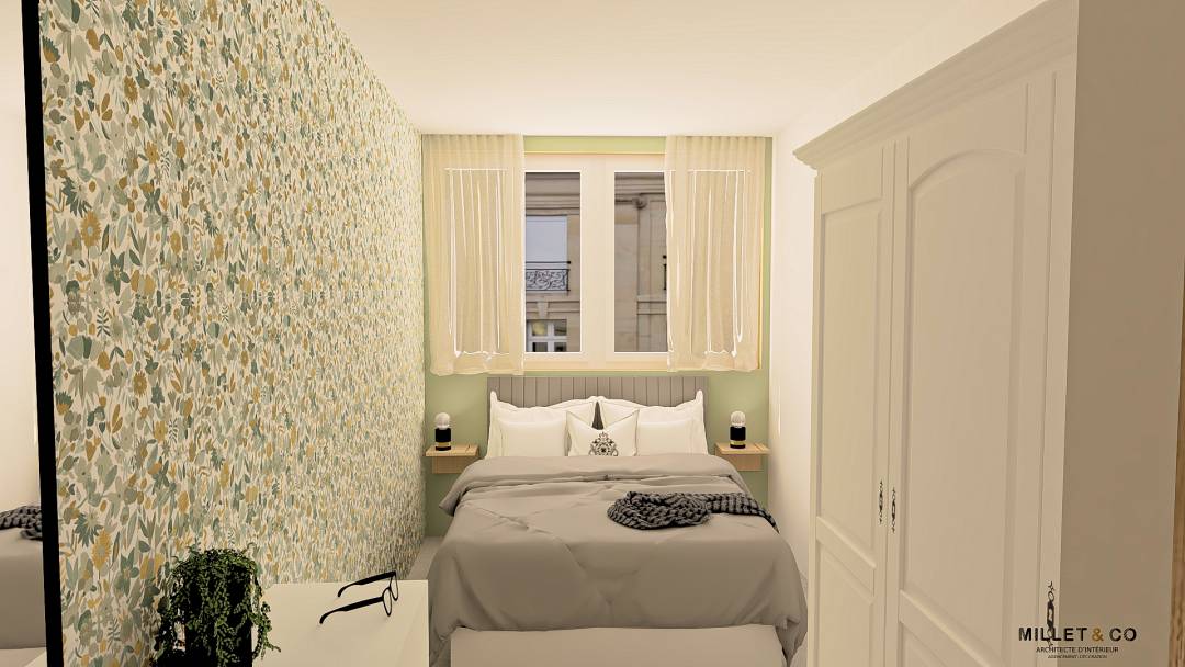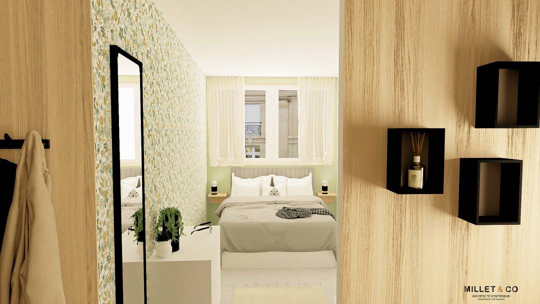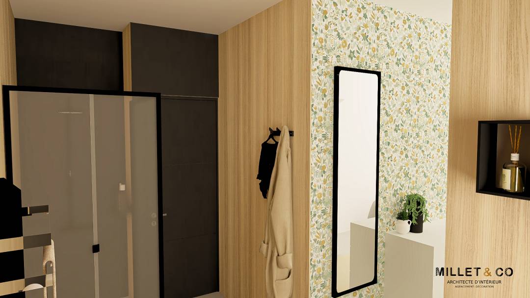 Rénovation d'une chambre parentale dans le secteur du Pays Fléchois, Sarthe (72). Mes clients m'ont contactée pour que je leur propose un aménagement et une décoration qui leur ressemble pour leur chambre et leur salle de bain. Cela fait un moment qu'ils souhaitaient faire des travaux de rénovation, mais ils ne savaient pas par quoi commencer et ils n'avaient pas d'idées en termes de décoration. Les objectifs étaient de rendre la pièce beaucoup plus apaisante et fonctionnelle. Il fallait aussi faire en sorte que les couleurs douces et apaisantes qu'aime ma cliente s'harmonisent avec l'esprit industriel que préfère son mari. C'est pour cela que j'ai positionné plutôt la couleur verte et la papier peint végétal au niveau de l'espace couchage et au niveau de la salle de douche des matières comme le bois, le métal, le gris orage.
