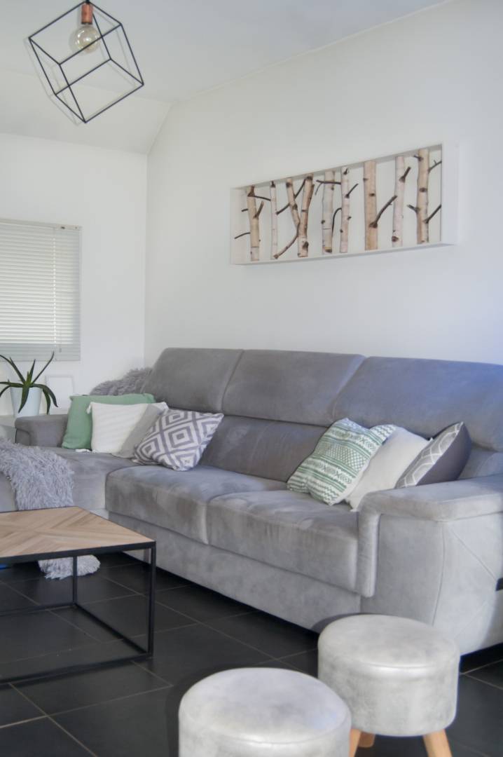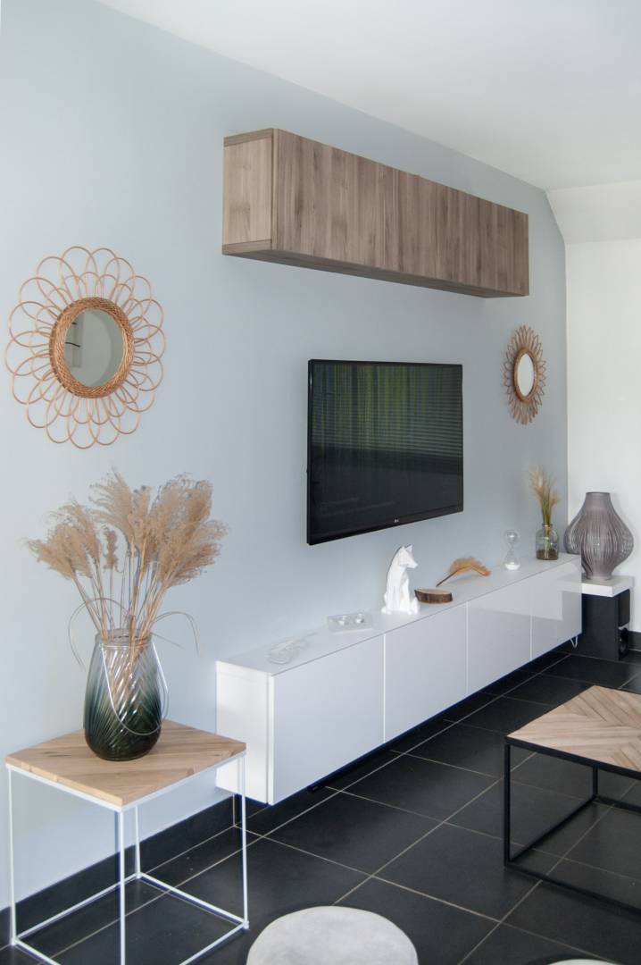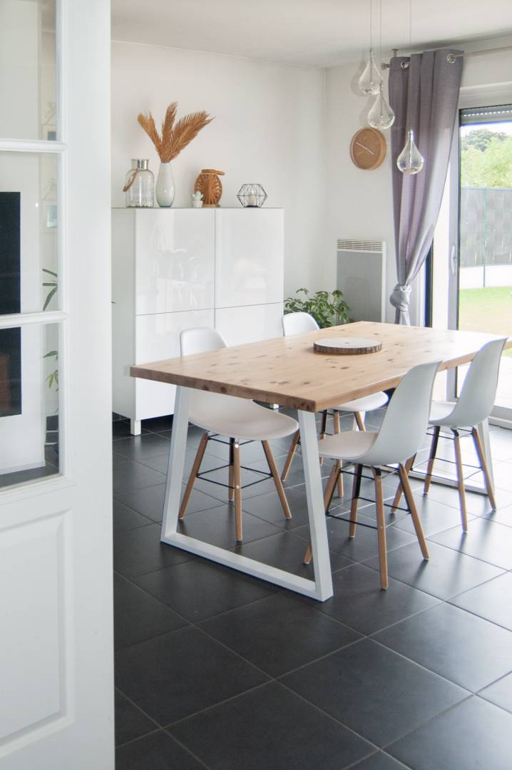 Création table avec plateau chiné et pieds sur mesure en métal blanc, chaises blanches style scandinace, mobilier ikéa modulable, (pour le meuble tv et le bahut) canapé TOFF, coffrage de l'insert existant pour apporter de la modernité et de légèreté à l'ensemble, murs blanc en majorité, touche de gris perle pour contraster subtillement.