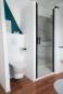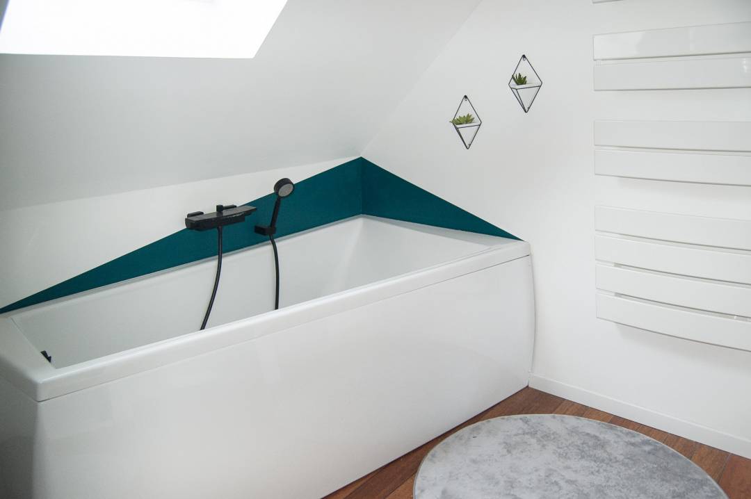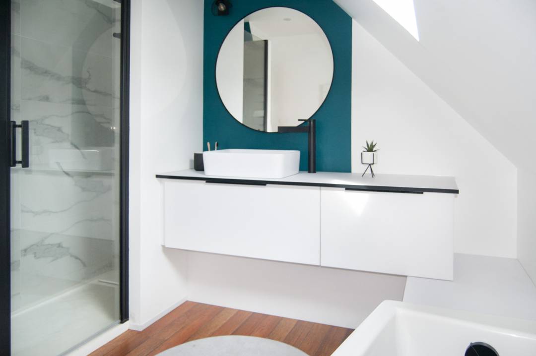 Salle de bain complètement réaménagée , nouvelles arrivées et évacuations d'eau en multicouche, conservation du sol existant; équipement avec baignoire, partie sanitaire et création d'une douche italienne fermée avec porte, un meuble vasque avec de l'espace de dépose et du rangement, couleurs lumineuses pour agrandir l'espace. Couleur marquée par espace pour définir les fonctions et structurer l'ensemble; touche de noir pour un ensemble harmonieux et graphique.