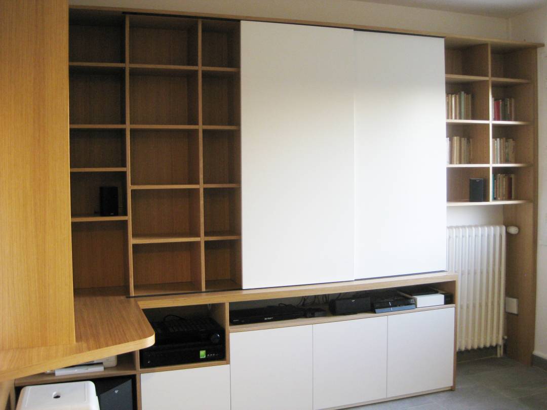 Rénovation d'un séjour pour l'ouvrir sur l'entrée, aménagement d'un bureau, et d'une chambre. Réalisation de mobilier et d'agencement sur-mesure.