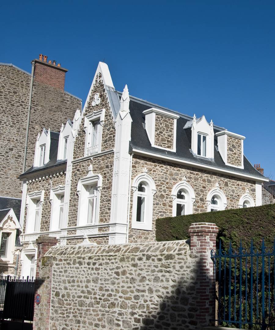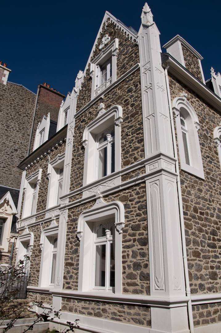 Cet hôtel particulier, dont les extérieurs sont classés aux bâtiments de France, présente un style peu courant de type Néo-Gothique, avec des fenêtres sculptées, des arcs en ogives, une architecture et une modénature de façade exceptionnelles. Lors de l'acquisition, cette maison était divisée en plusieurs appartements avec de nombreuses pièces. Nous avons cassé tout l’intérieur pour recréer des niveaux, des espaces plus grands, en y ajoutant tout le confort moderne d’une bonne isolation, d’un système de chauffage performant avec des sanitaires à chaque étage. La particularité des fenêtres ne nous a pas permis de les changer entièrement. Nous les avons rénovées en remplaçant uniquement les ouvrants, équipés de doubles vitrages avec isolation thermique renforcée. Le Rez-de-chaussée est un unique espace accueillant séjour-salon-bureau et une cuisine pouvant être séparée par une double porte coulissante à galandage. Les deux étages accueillent 6 chambres et 2 salles de bain.