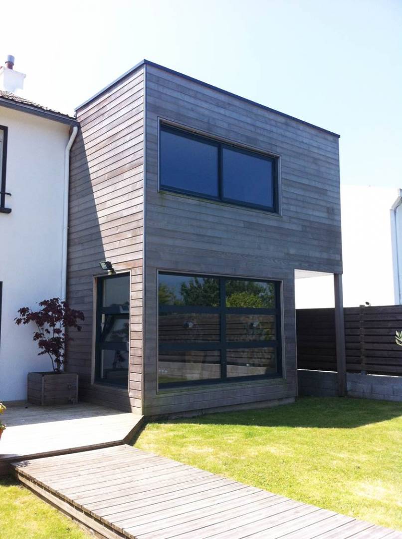 Cette maison de ville des années 1970 présentait un style traditionnel, sans charme. L’ajout de cette extension bois a redonné un style contemporain à cette maison, qui aujourd’hui est remarquable. La maison comprenant initialement 3 chambres et un petit séjour, s’est agrandie pour ajouter deux chambres supplémentaires à l’étage, et créer un double salon en rez-de-chaussée. Le garage attenant était pré-existant, mais a été intégré dans le projet en l’enveloppant du même bardage en lames de bois naturel de Red Cedar que l’extension, afin de créer une unité. De grandes baies vitrées permettent d’illuminer les pièces à vivre, et de récupérer les apports solaires, pour quelques degrés de plus en hiver dans la maison. Des volets roulants à lames inclinables permettent de se protéger des surchauffes.