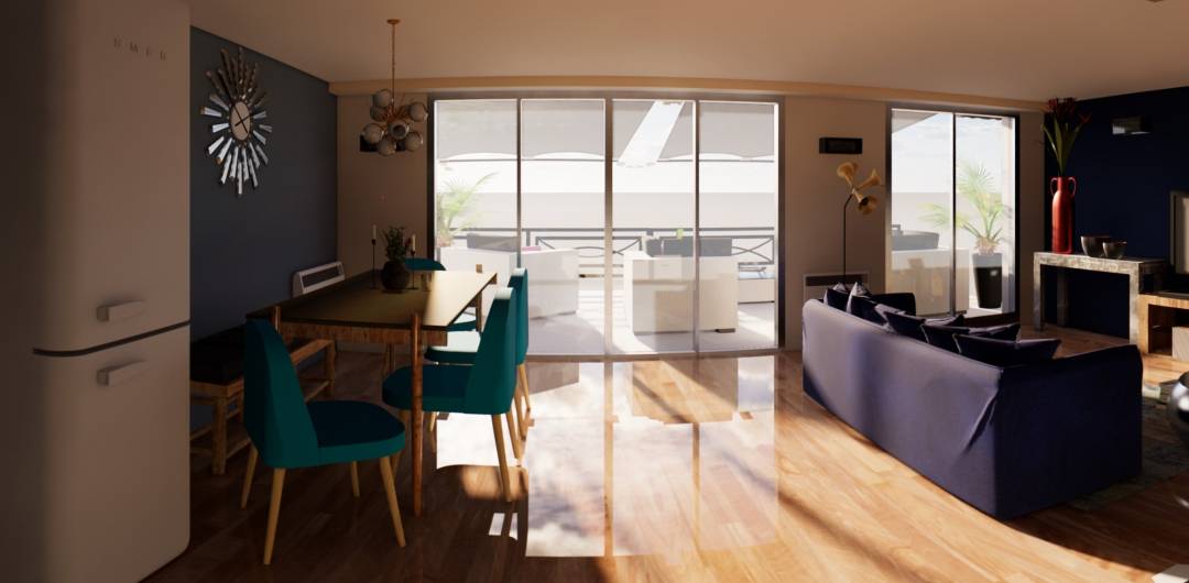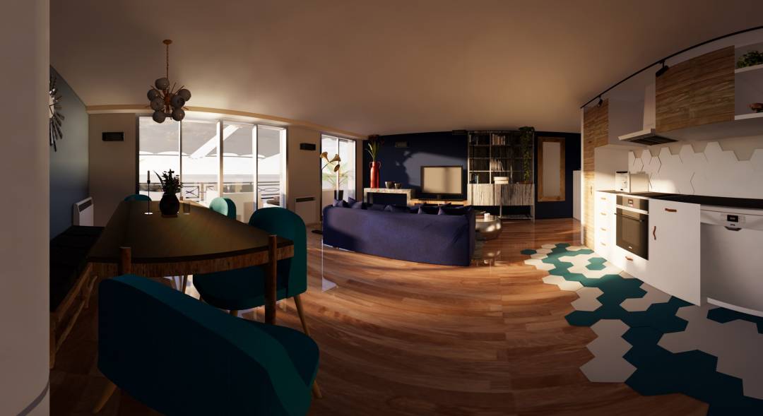 Les propriétaires souhaitaient transformer leur ancienne pièce de vie en grand espace cumulant toutes les qualités : fonctionnalité, confort, élégance, chaleur et bien sûr, harmonie. C’est là que j'interviens, avec toutes ses compétences techniques et idées créatives. Première étape, la démolition des anciennes cloisons, afin de créer un vaste espace ouvert intégrant cuisine, salle à manger et salon. Baigné de lumière grâce à ses deux grands baies vitrées, l’endroit a littéralement fait peau neuve ! C’est ainsi que tout a été supprimé sur place : les cloisons donc, mais aussi le mobilier, les accessoires, sans oublier les sols. Déposés jusqu’au dernier carrelage, ils accueillent aujourd’hui un parquet collé en chêne rustique, sauf dans la partie cuisine. Composé d’un linéaire réalisé sur-mesure en bois blanc et beige, cette dernière est délimitée par un tapis de carrelage hexagonal qui s’interpénètre avec le parquet du séjour. Pour les murs, j'ai opté pour une peinture écologique Algo. Côté couleurs, j'ai privilégié des tons naturels (blanc, beige, gris), relevés par quelques touches vives de rouge et de bleu. Cette combinaison sert une ambiance aussi contemporaine que chaleureuse, dans laquelle s’intègrent harmonieusement le mobilier et les accessoires : canapé Tinos en bois avec un tissu en lin de l’Héritier du Temps, banc en rotin de Tikamoon, luminaires Goose, tapis en laine et en soie de bambou de luxe Heritage Design par Angelo…