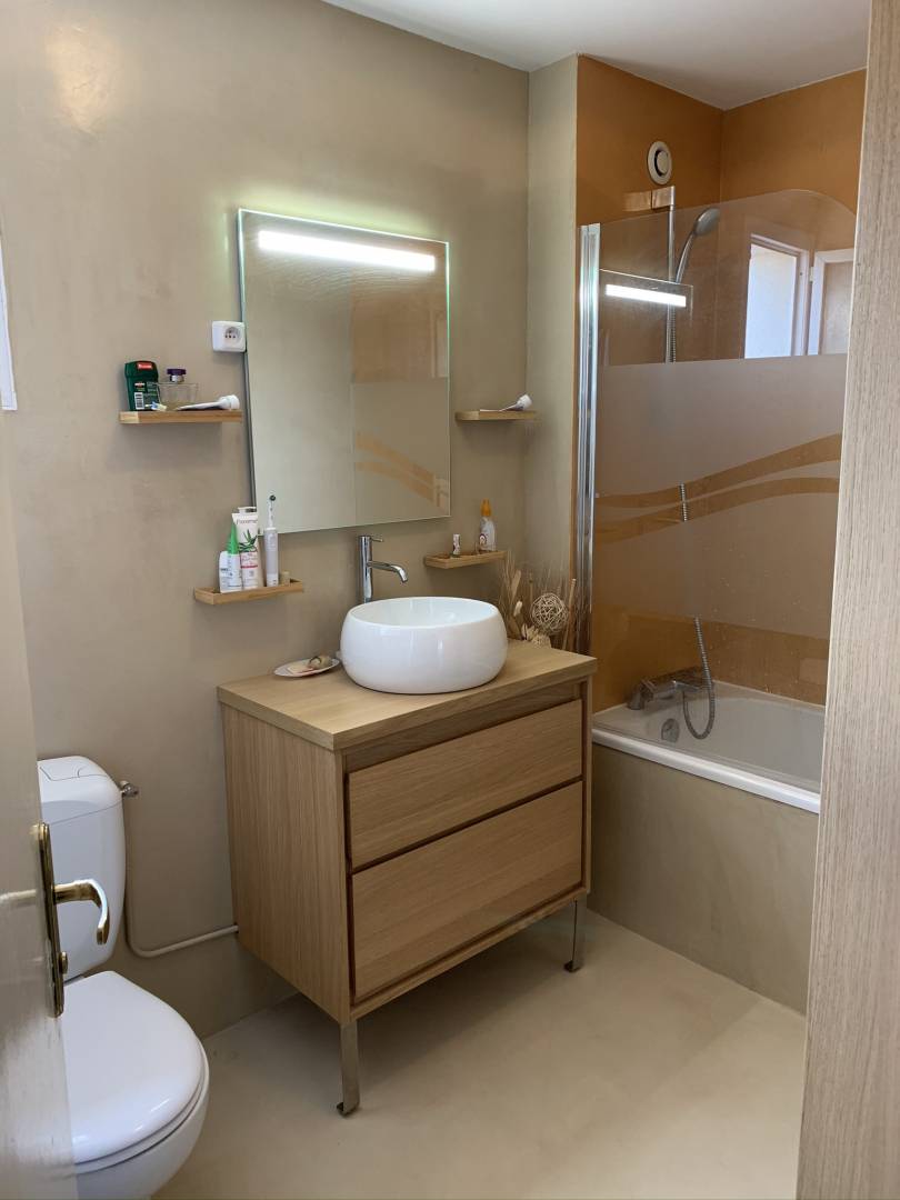 Mme et Mr S. ont fait appel à moi afin que je leur propose une nouvelle décoration pour leur salle de bain. Outre l'ambiance datée, ils souhaitaient avant tout faire disparaitre les dessins disséminés sur les murs, de chasseurs munis de lances poursuivant des éléphants. Afin de respecter leur budget et plus de simplicité dans les travaux, j'ai proposé de recouvrir les murs et le sol d'un béton aux couleurs chaudes. Le meuble vasque d'origine aux formes arrondies était peu pratique. Il a été remplacé par un meuble en bois à tiroirs qui permet davantage de rangements, et une colonne haute a été ajoutée. Une baignoire de taille standard a pris place à l'emplacement de la baignoire d'angle d'origine, inadaptée pour cette petite pièce.