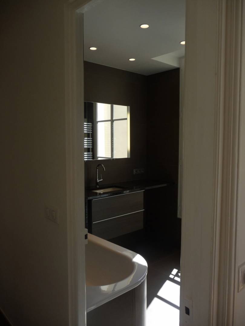 Mon client avait besoin de rénover l’intérieur de cet appartement haussmannien de 100 m² pour mise en location. Nous avons fait une rénovation complète de l’existant incluant la mise aux normes des sanitaires et l’installation électrique. La salle de bains a fait l’objet d’un agrandissement en l’aménageant avec un mobilier contemporain (vasque, douche à l’italienne …). Quant à la cuisine, elle a été réalisée sur-mesure en privilégiant la couleur gris pâle pour accentuer la lumière dans la pièce.