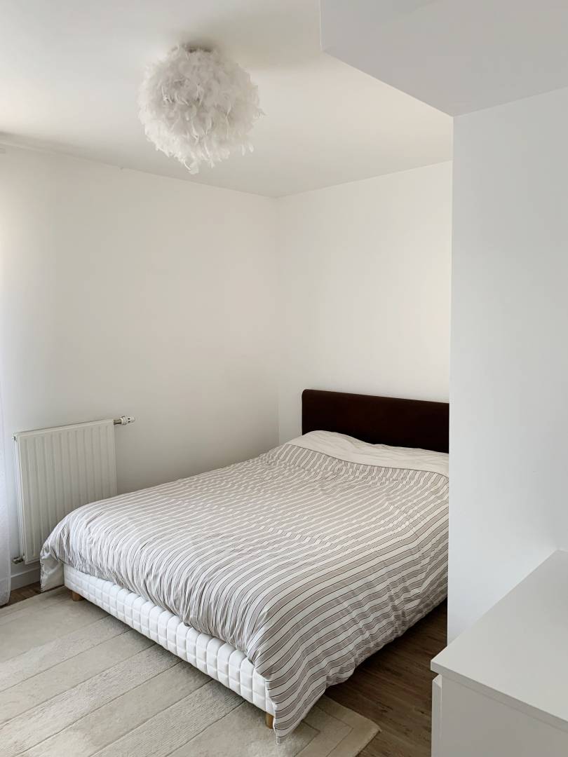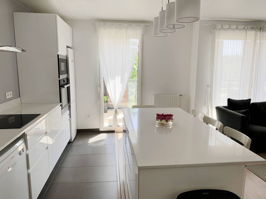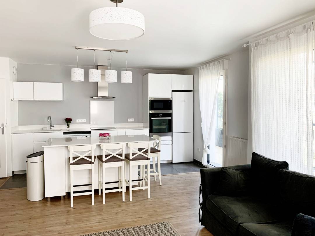 Réaménagement d’un appartement de 105m2, acheté sur plans et livré neuf à Bois-Colombes. Les clients avaient besoin de conseils professionnels pour aménager au mieux les espaces et ne voulaient pas faire trop de travaux. Les appartements en VEFA (vente en l’état de futur achèvement) sont souvent livrés sans cuisine, équipés seulement d’un petit meuble avec évier et robinet. Les travaux ont principalement porté sur la conception et l’installation de la cuisine avec îlot central. Les clients ont opté pour une cuisine avec des meubles blancs et plans de travail en granit effet marbre. Le mur du fond a été peint en gris lavande afin de donner un peu plus de profondeur. Pour gagner du temps, des rendez-vous avant livraison ont été nécessaires afin d’anticiper et planifier au maximum les interventions. Dans un premier temps, nous avons prévu l’installation des meubles de cuisine et de l’électroménager. La modification des prises électriques en fonction du plan d’implantation a aussi été nécessaire. Dans un deuxième temps, nous avons planifié la prise de côtes par le poseur pour effectuer un gabarit de l’emplacement exact des éléments. Après quoi, la fabrication des plans de travail en granit a pu être lancée. Celle-ci peut varier de 4 à 8 semaines avant de pouvoir effectuer la pose. Il a fallu une bonne coordination entre les différents corps d’état pour avoir une cuisine prête à l’emploi relativement rapidement.
