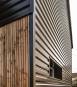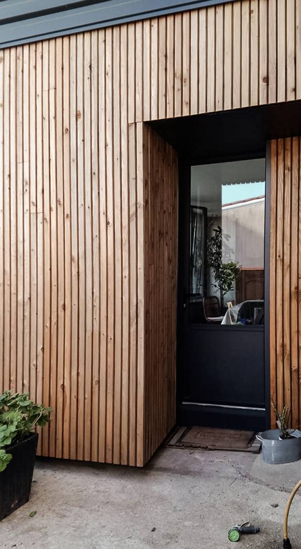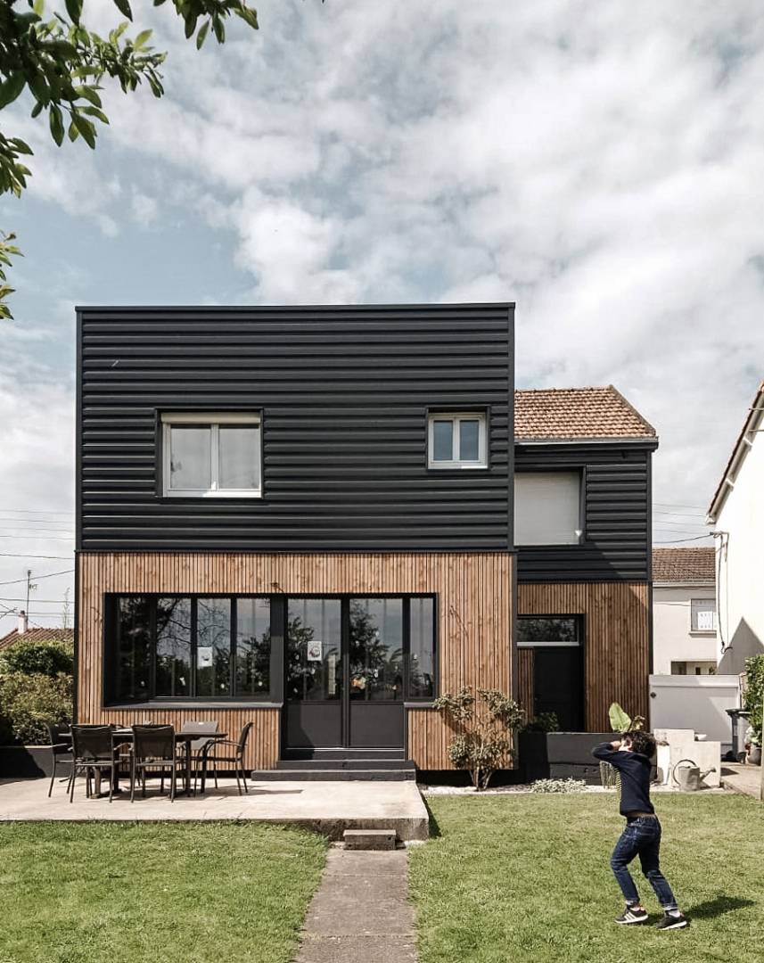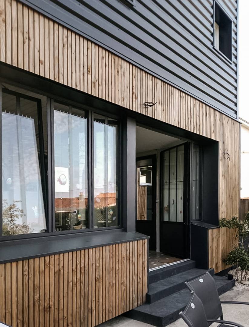 Les tasseaux de bois donnent à la partie basse un aspect chaleureux, tandis que des ouvertures en aluminium anthracite, dont le rythme resserré affirme un style industriel rappelant l’ancienne véranda, donnent sur une grande terrasse en béton brut au rez-de-chaussée. En partie supérieure, le bardage horizontal en tôle nervurée anthracite vient contraster avec le bois, tout en résonnant avec la teinte des menuiseries. Grâce à l’accord entre les matières et à la subdivision de cette façade en deux langages distincts, l’effet de verticalité est estompé, instituant ainsi une nouvelle échelle plus intimiste et accueillante.