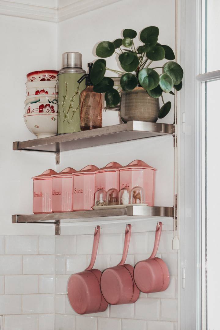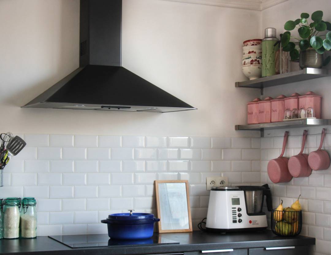 Le cahier des charges des clients était le suivant : imaginer une cuisine ouverte sans meubles hauts, en y intégrant un grand réfrigérateur congélateur et en dissimulant la chaudière déjà installée dans la pièce. D’un point de vue décoratif, des tons assez neutres (meubles gris laqué et crédence en faïence métro blanche) ont été adoptés, relevés par un carrelage grès cérame bicolore moutarde et marron au sol. Les deux meubles colonnes permettent de faire l’impasse sur les meubles hauts, conformément aux souhaits des clients. Le reste de la composition se cale sur une même ligne d’horizon pour donner de la profondeur à la pièce. On remarque les étagères sur les murs de côté, qui cassent la linéarité du premier plan de travail et des meubles bas. Bien sûr,  l’ergonomie a été au cœur de sa réflexion. C’est ainsi que les fonctionnalités (lavage, froid et cuisson) ont été pensées en triangle, au profit des circulations. Résultat : une petite cuisine aménagée comme une grande, dans laquelle on évolue aisément ! Bref, un endroit où l’on se sent bien…