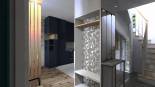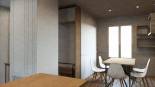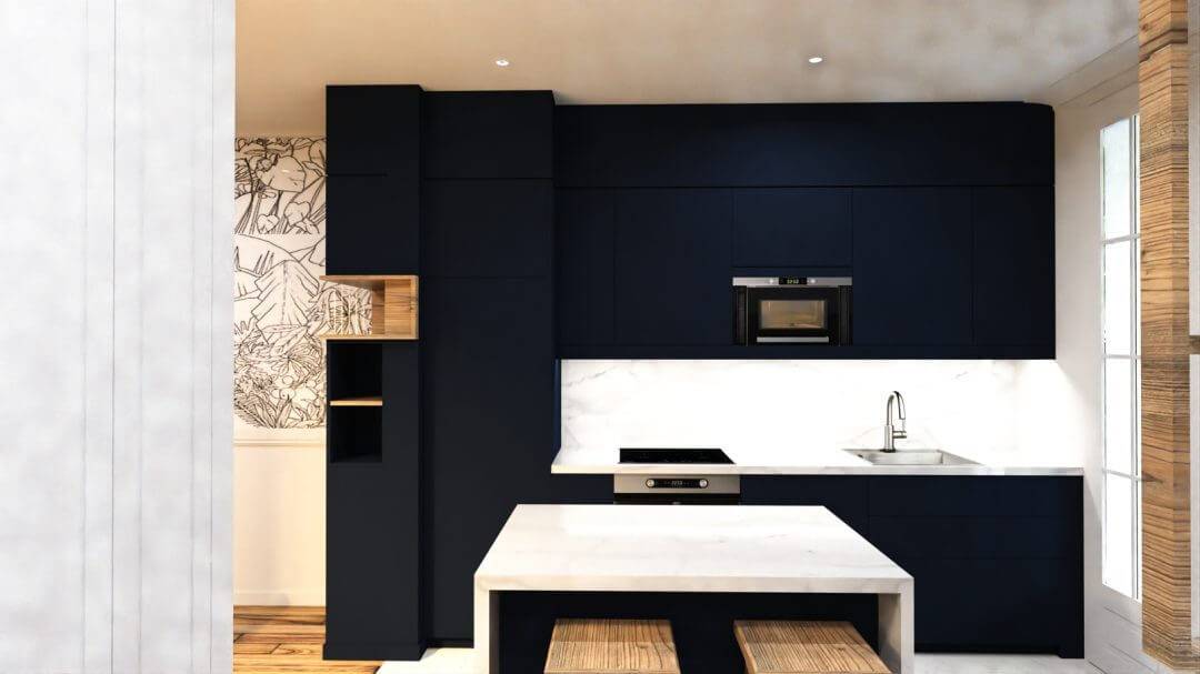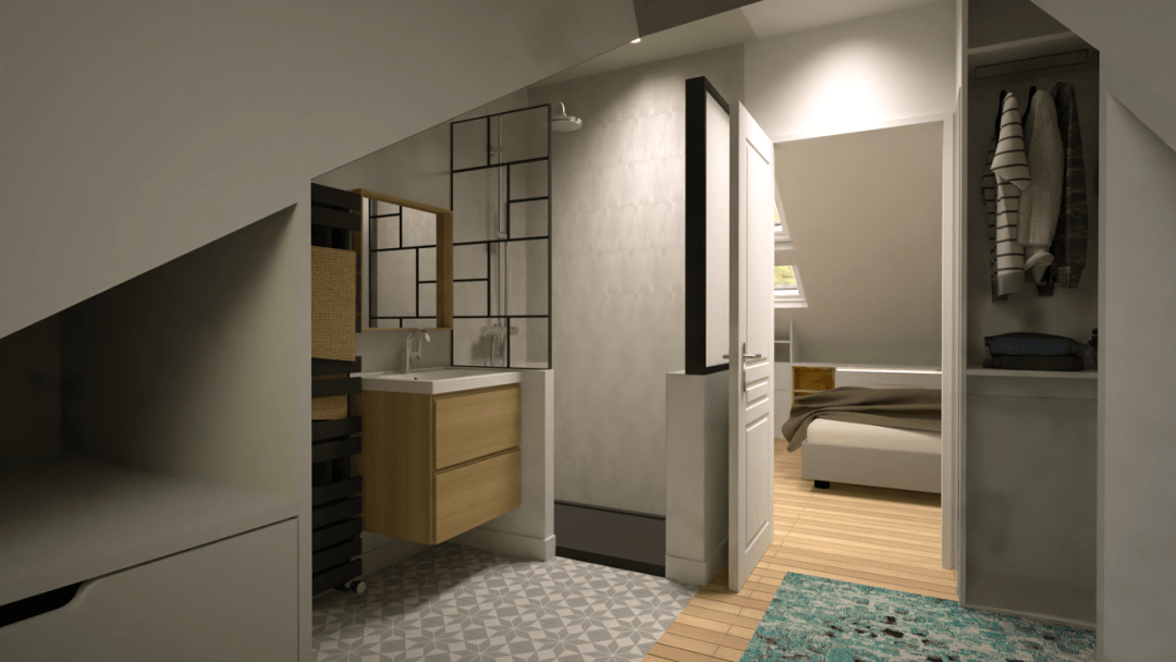 Pour ce projet, nous avons rénové la quasi-intégralité du logement. Dans une situation difficile liée aux conditions sanitaires, nous avons dû ruser d’ingéniosité afin de mener à terme le projet de notre client. Cette famille de quatre personnes souhaitait repenser l’intégralité de leur logement en amenant de la modernité et de la réalisation sur mesure. Pour mener à bien ce projet, il a fallu repenser tous les meubles qui composent le logement. Repenser une scénographie liée aux déplacements et à l’utilisation du logement. Nous avons créé un monolithe central qui sert aujourd’hui à cacher l’appareillage électroménager côté cuisine et à créer des rangements côté séjour, entrée et salle à manger. Le rythme des différents occupants nous a obligé à repenser le positionnement des rangements pour favoriser la fonctionnalité et praticité pour leur utilisation. Le claustra dessiné et réalisé sur-mesure a permis de cloisonner l’entrée de manière ajourée, pour laisser passer la lumière tout en créant des rangements.