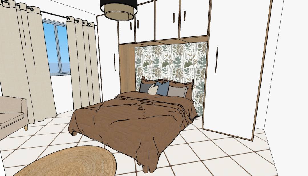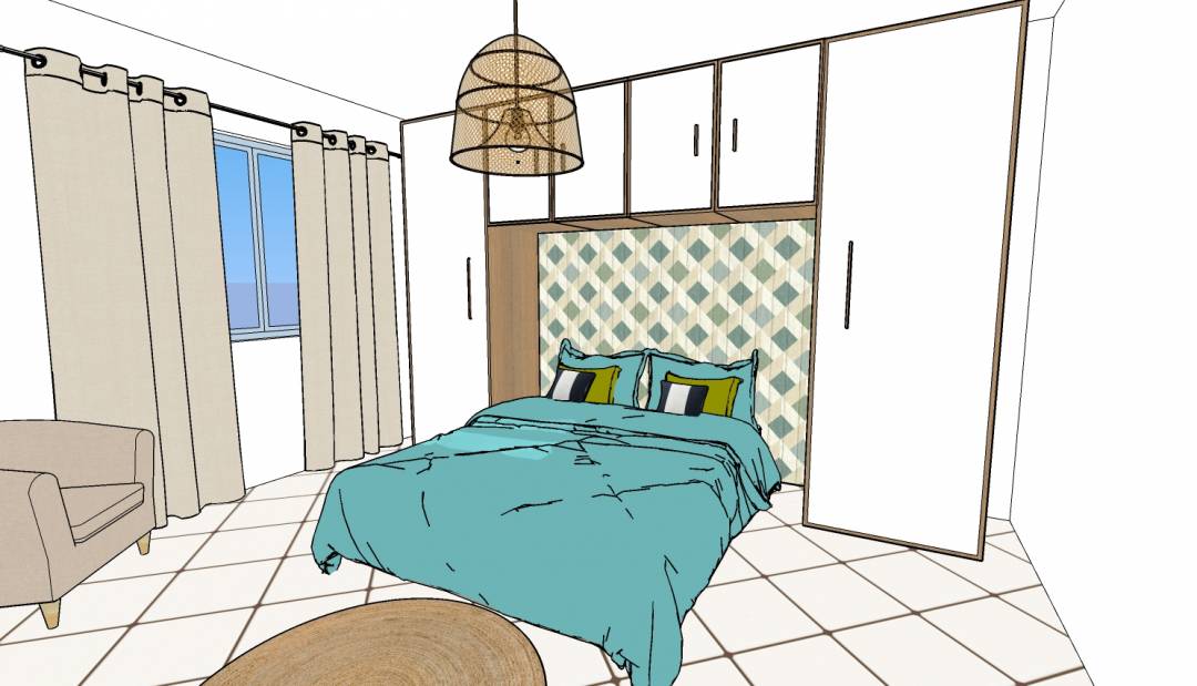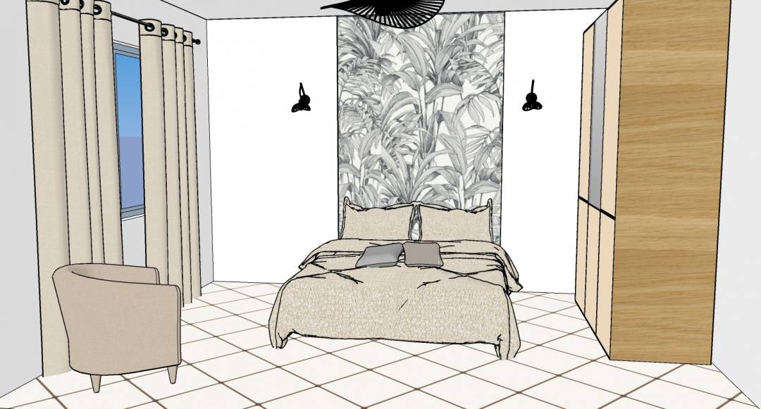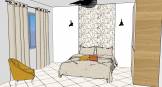 Cahier des charges pour 2 chambres d'amis : Chambre 1 : Conserver le placard de rangement Conserver la suspension lumineuse Conserver le sol Conserver le lit de 140x200 Prévoir un fauteuil, de nouveaux rideaux Chambre 2 : Conserver le sol Conserver le lit de 140x200 Prévoir du rangement, un fauteuil, un tapis et de nouveaux rideaux