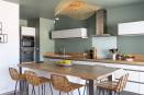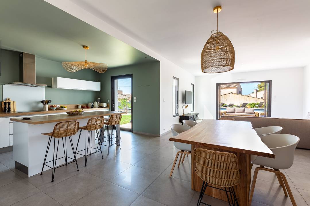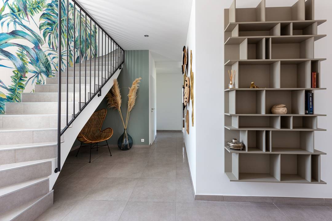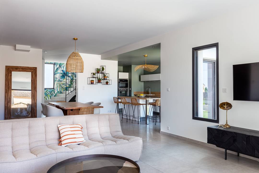 Résidant en région parisienne, les nouveaux propriétaires avaient découvert la ville lors de leurs précédentes vacances estivales. Ce fut un coup de cœur ! Adeptes du télétravail, il ne leur en fallut pas plus pour s’imaginer vivre entre Paris et La Ciotat, à condition toutefois de trouver le bien qui convenait à la situation. C’est ainsi qu’ils jetèrent leur dévolu sur une belle maison contemporaine de 165 m², avant de m'en confier la décoration. Le cahier des charges était le suivant : imaginer une ambiance comme dans un lieu de vacances à Ibiza. Préalable indispensable, la repeinture en blanc des murs. Un coup de neuf d’autant plus utile qu’il met en valeur les couleurs que j'ai sélectionné, principalement le vert et le taupe. Le bois, l’osier et le rotin sont autant de matières naturelles exploitées au service de l’atmosphère bord de mer. On remarque également le papier peint à motifs végétaux réalisé sur-mesure chez LGD01 pour habiller la cage d’escalier. De facture contemporaine, les meubles se distinguent par leur design balnéaire. Ainsi en va-t-il des tabourets dans la cuisine (en provenance de Maloha Décoration), des chaises à coque blanche Hay dans la salle à manger ou encore du mobilier de salon Ethnicraft.