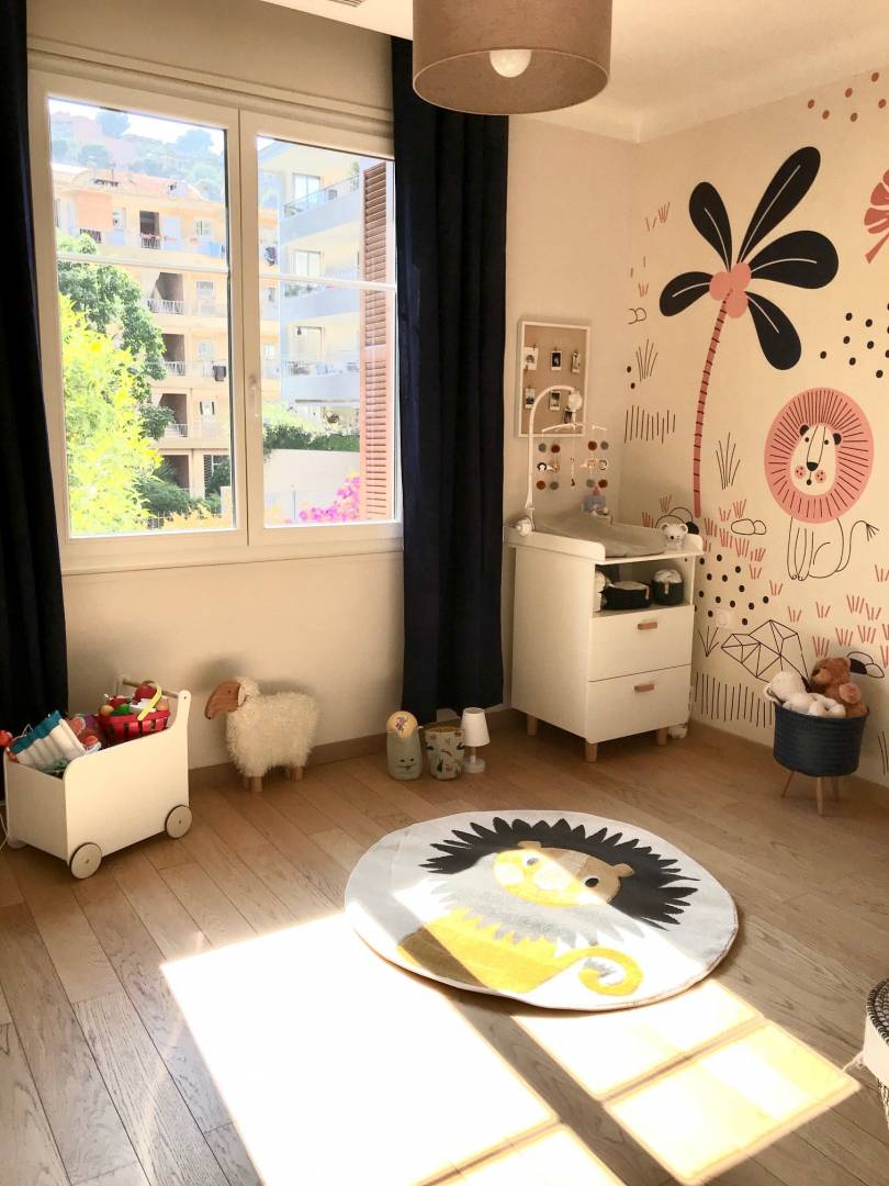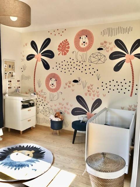 Transformer rapidement une chambre parentale en chambre de bébé. J’ai gardé rideaux et luminaire et n’ai changé que la tapisserie pour créer un univers d’enfant. Je me suis adaptée aux meubles que ma cliente avait déjà : lit et table à langer. Quelques articles bleu marine pour rappeler les rideaux et les palmiers de la tapisserie et le tour est joué. Shopping list préparée pour la cliente : tapis, paniers, lampe de chevet, tabouret, cadre photo. Résultat : une chambre plus lumineuse, effet wahou garanti grâce à la tapisserie sur mesure!