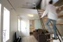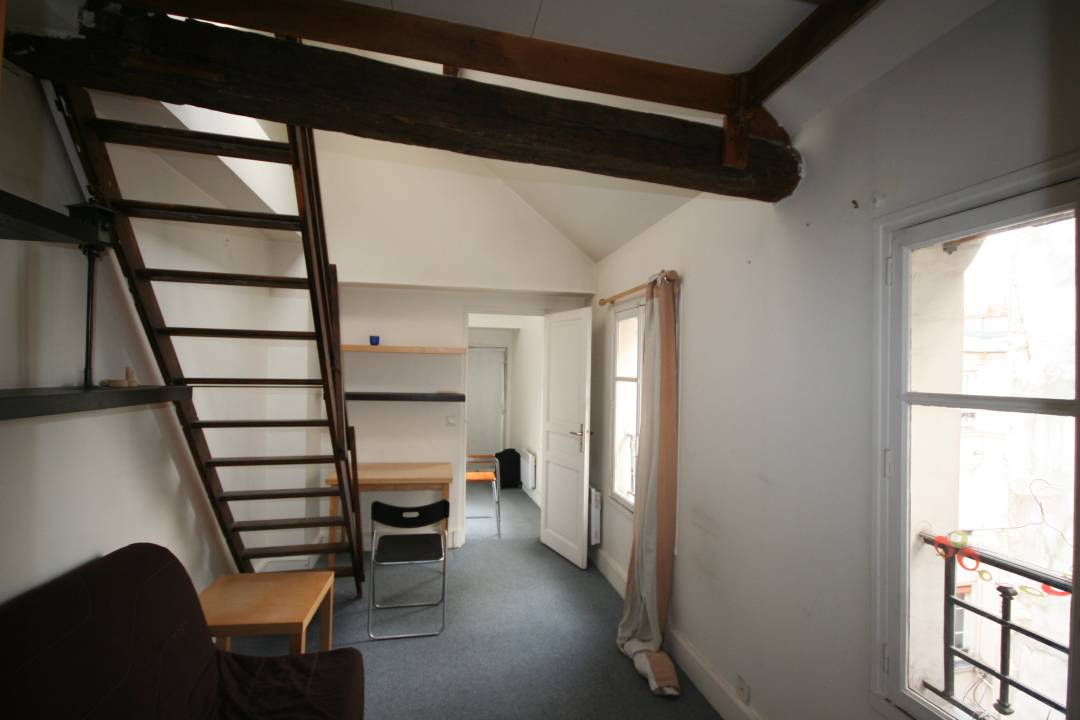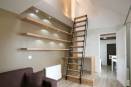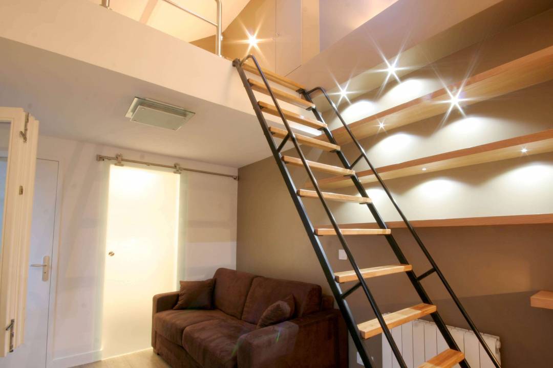 A Paris, un demi mètre carré... c'est pas gratuit ! Dans cette surface tout en longueur et très haute de plafond la solution de la mezzanine était logique. Comment y accéder ? Cette échelle que nous avons créée sur mesure est très aérienne et laisse passer la vue. Elle est aussi pivotante et permet de libérer 1,1m² au sol alors que l'on ne l'utilise pas. Pour ces travaux encore, instant|t architectes s'est occupé du projet de A à Z, de la visite préalable à la remise des clefs. Travaux terminés dans les temps et sans surcoût.