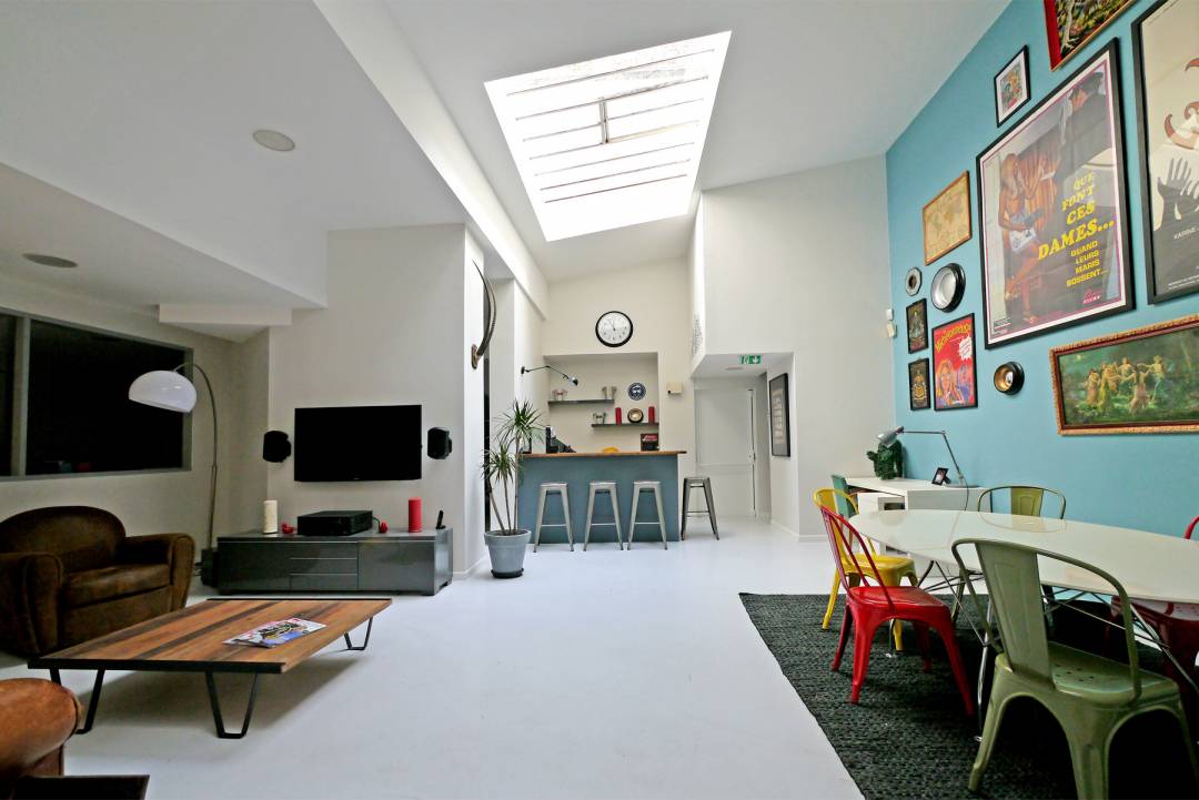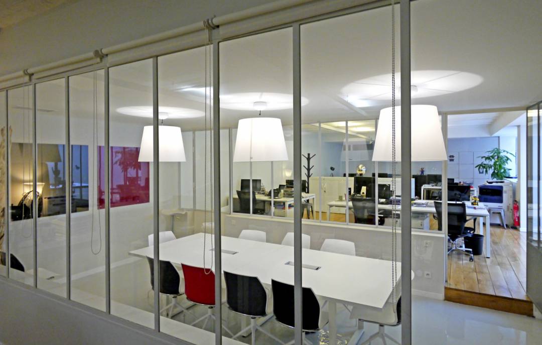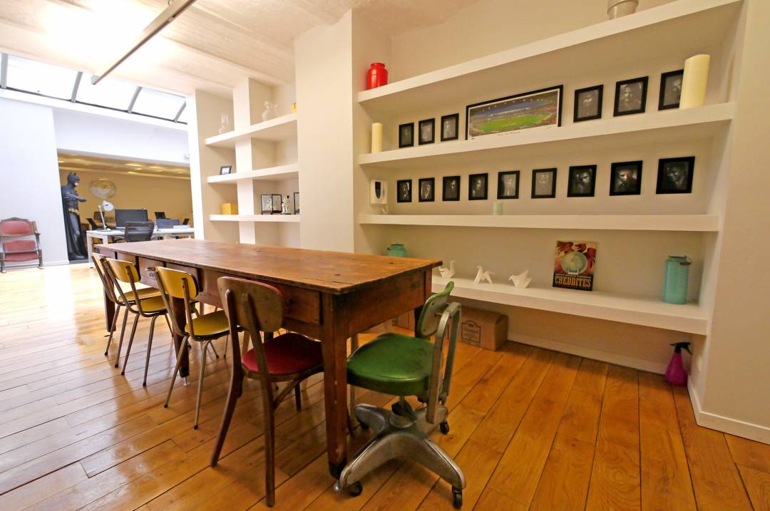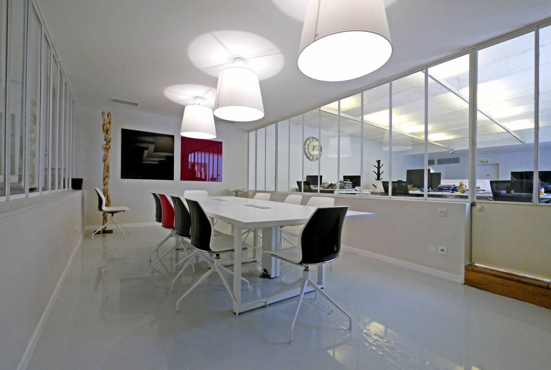 Aménagement d’une société de production de 370 m² Mission complète, choix du mobilier et accessoires de décoration. Dans cette ancienne usine, le projet allie la fonctionnalité des espaces, et une ambiance industrielle. Le projet se veut très fonctionnel par le choix de bureaux, de chaises, et rangements ergonomiques et à la fois très ludique par le choix des mobiliers et accessoires de brocanteurs, des effigies cartoon et autres petits accessoires. Pour permettre à la lumière zénithale de pénétrer dans tous les espaces, les salles fermées sont traitées comme des petits volumes de verre.