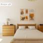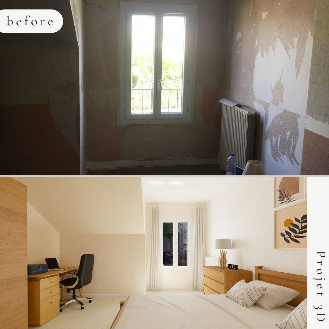 Une chambre à rénover en apportant de la douceur et de la luminosité (contrainte : mur avec une soupente). Pose d'une jolie moquette moderne et facile d'entretien et d'un papier peint à motif pour habiller le plus grand mur (5 mètres). Il fallait conserver un coin bureau, aujourd'hui plus épuré et se servir de deux commodes en guise de tables de chevet afin de garantir un maximum de rangement.