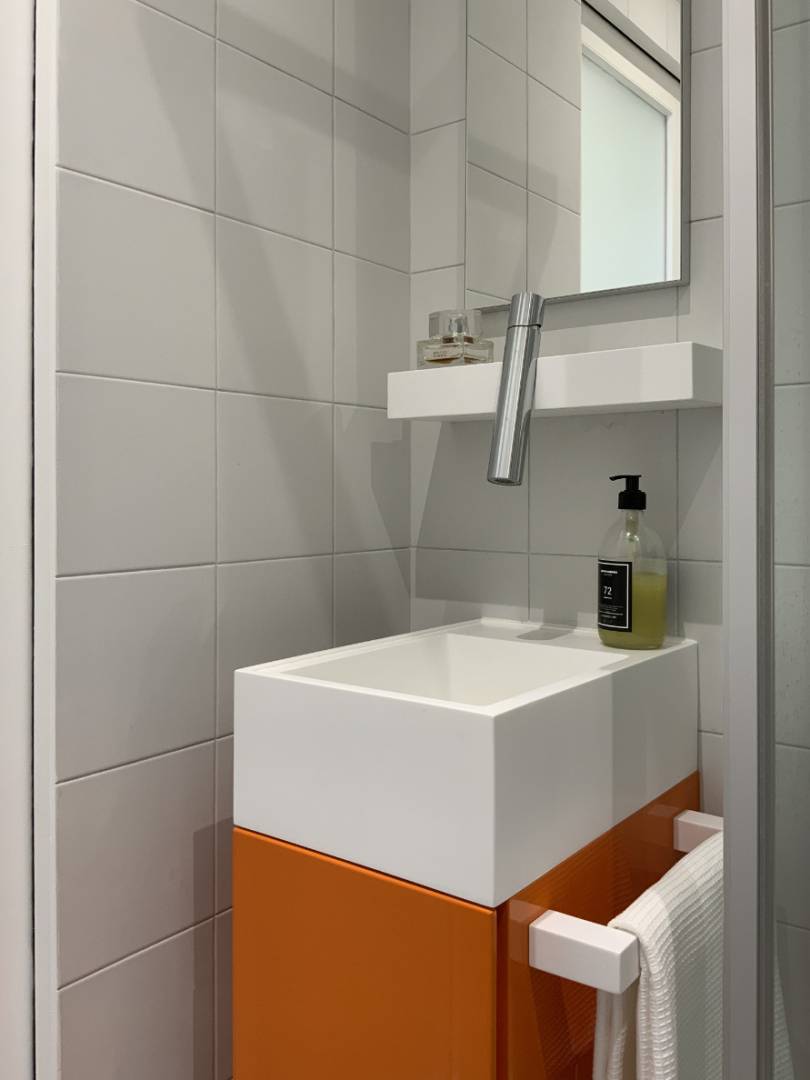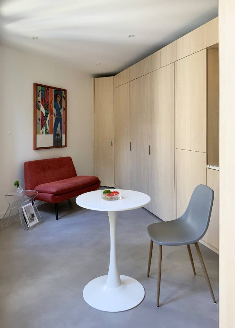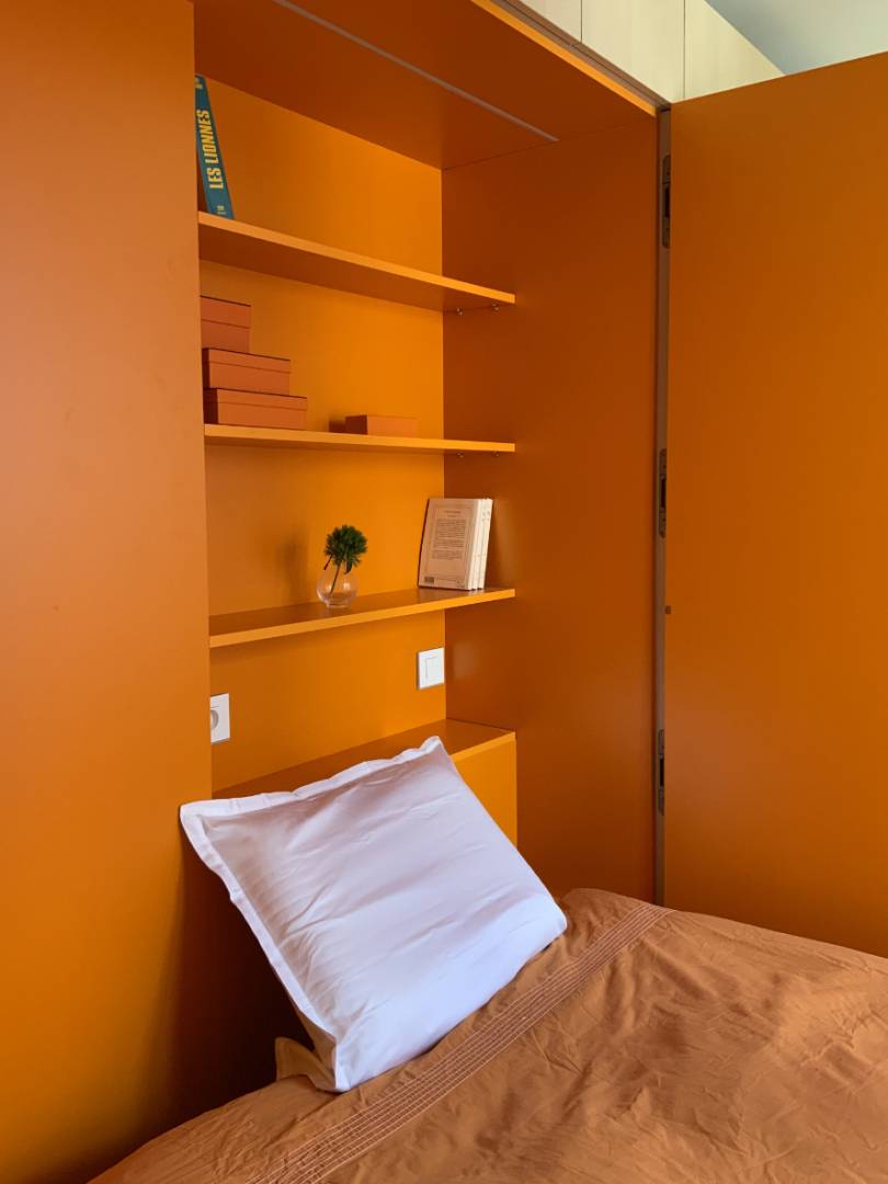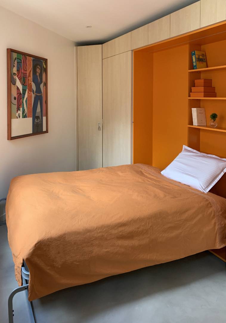 Le propriétaire de ce petit studio nous sollicita suite à un incendie qui avait entièrement détruit son logement : les murs étaient alors couverts de suie, toutes les menuiseries, y compris les fenêtres, avaient brûlé, les appareillages électriques avaient fondu et le faux-plafond s’était effondré. Bien sûr, l’objectif de la rénovation fut de remettre le logement en état mais aussi de profiter de ce sinistre pour en repenser le plan et optimiser ce minuscule 17 m². Avant travaux, le studio était cloisonné en deux pièces : d’un côté, la cuisine et, de l’autre, la pièce de vie faisant office de séjour et de chambre. Si ouvrir systématiquement n’est pas toujours judicieux, il était ici approprié, compte tenu des dimensions du lieu, de démolir la cloison existante afin de créer une grande pièce principale de 14 m² environ. Ce décloisonnement permit, en outre, de mettre en valeur l’enfilade de trois fenêtres, très rare dans ce type de bien, et de profiter pleinement de la lumière apportée par la belle exposition sud-ouest.  Le propriétaire souhaitait un lit escamotable et de nombreux rangements pour dissimuler deux grandes valises, un climatiseur mobile, l’électroménager, etc. En outre, amateur de pâtisserie, il avait besoin d’une cuisine pratique.   Pour répondre à ce cahier des charges, nous avons imaginé un « Couteau suisse », c’est-à-dire un grand meuble sur mesure accueillant toutes les fonctions habituelles d’un logement, c’est-à-dire cuisiner, dormir et ranger. Se développant sur toute la longueur du plus grand mur du studio, il permet en outre de cacher deux boisseaux de cheminée disgracieux et de s’adapter au plan atypique du logement.    Au niveau de la cuisine, le meuble « Couteau suisse » accueille l’électroménager demandé par le propriétaire (un four Kitchenaid, un réfrigérateur et un grand congélateur) mais dissimule aussi deux poubelles coulissantes, une hotte à extraction, un lave-linge et même un égouttoir à vaisselle dans un meuble haut. Le robinet mitigeur, quant à lui, est équipé d’une douchette extractible.  À côté de la cuisine, le meuble dissimule l’espace nuit. Le lit escamotable est caché par une porte battante à deux vantaux qui, une fois ouverts, forment une sorte de paravent : il nous paraissait important de structurer la pièce principale en séparant la « chambre » du reste du studio afin de la rendre le plus intime possible. La tête de lit offre également des étagères et un caisson de rangement pour les oreillers.  D’autres rangements occupent l’extrémité du meuble, en particulier un petit « dressing » avec une tringle télescopique et un grand placard dans l’angle du studio.  Enfin, d’un point de vue technique, le « Couteau suisse » dissimule le chauffe-eau et la gaine électrique.  L’objectif d’optimisation a été le même dans la salle de douche et l’entrée. Dans la salle d’eau, la douche a été agrandie au maximum et possède désormais un receveur confortable de 90 x 70 cm. Un meuble de rangement sur mesure surmonte le bâti-support des toilettes et une porte coulissante à vitrages dépolis laisse passer la lumière en second jour, tout en facilitant la circulation dans cette minuscule pièce de moins de 2 m². Enfin, l’espace est exploité jusque dans l’entrée. En effet, un miroir et un petit vide-poche répondent aux fonctions traditionnelles de cette pièce et un étendoir à linge escamotable est même dissimulé dans un caisson suspendu au-dessus de la porte d’entrée.  Afin d’accentuer la luminosité de l’appartement et la sensation d’espace, nous avons choisi des matériaux simples qui créent une ambiance pure. Le sol est en béton ciré, il unifie et agrandit le studio. Il est en harmonie avec l’agencement, réalisé en stratifié imitation bouleau, une essence claire et chaleureuse. La couleur accent est un orange vif. Il est notamment utilisé sur tout l’espace nuit afin de le séparer encore plus du reste du studio et créer un effet de surprise lorsqu’on en ouvre la porte. On le retrouve également, en touches plus sobres, dans le plan de travail en terrazzo de la cuisine. L’appartement se situant dans le quartier de Barbès, cette couleur vive est aussi un écho aux tissus chamarrés qu’on peut y voir dans les magasins africains. Pour terminer, cette rénovation a été l’occasion d’améliorer l’isolation thermique du studio, auparavant de faible qualité. Se situant sous les combles, les faux-plafonds ont été remplis de laine minérale et, avec l’accord de la copropriété, les menuiseries extérieures ont été équipées de volets électriques. Pour l’été, une fenêtre est munie d’un percement spécial pour recevoir l’évacuation d’air d’un climatiseur mobile.