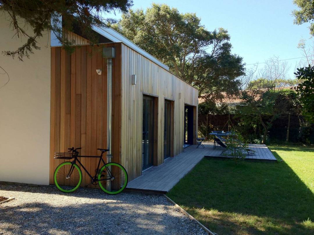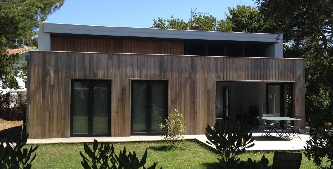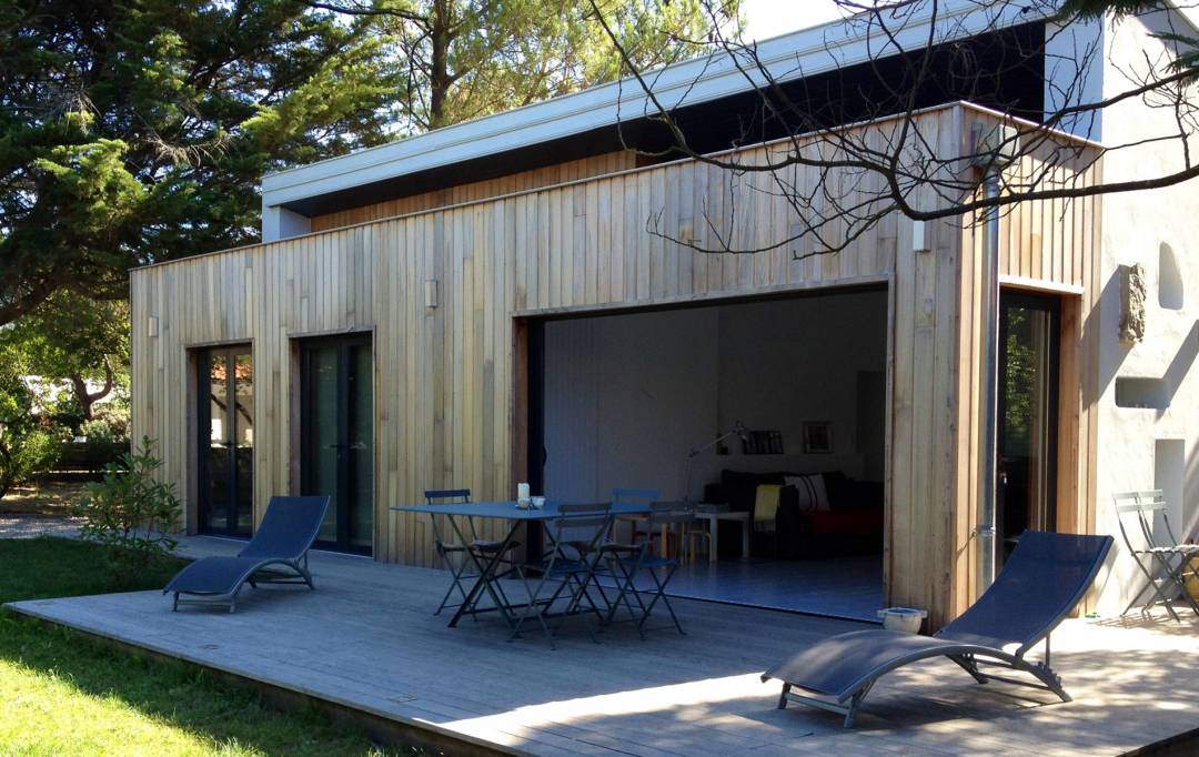Extension d’une résidence secondaire de 130 m² Mission complète, choix du mobilier et accessoires de décoration. Cette maison de vacances est située à 200m des dunes de la côte landaise. La simplicité de la volumétrie de l’extension et le choix du bois grisé rappellent les petites cabanes de pêcheurs de la côte atlantique. Cette extension redonne un caractère très moderne à cette maison des années 60, et s’intègre parfaitement dans la verdure du jardin. L’utilisation des baies à galandage permet l’été d’ouvrir toute la maison sur la terrasse et le jardin.