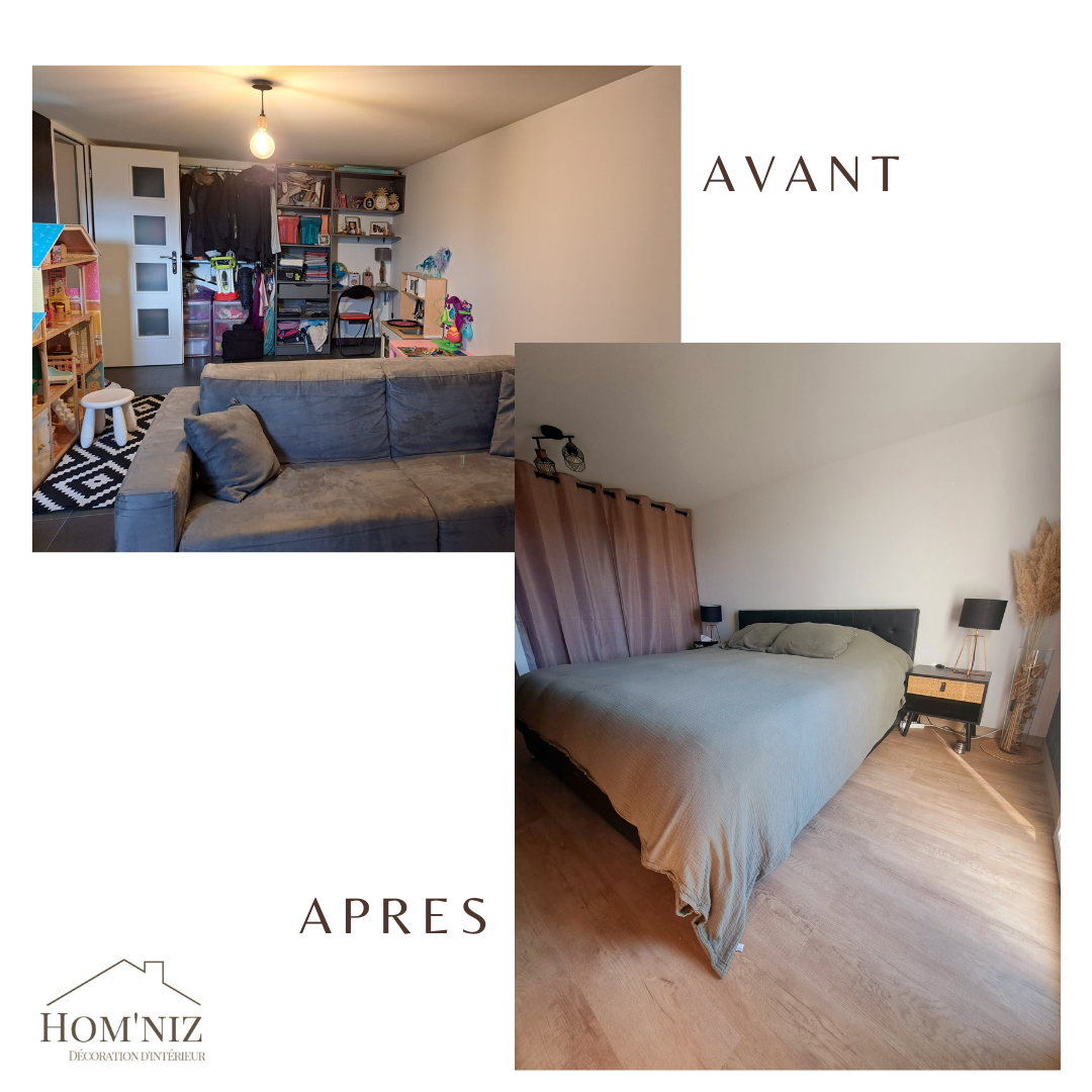 Les clients souhaitaient une chambre parentale dans une pièce de 18m2 avec une salle d'eau et un dressing. Une salle de douche fermée a été créée avec un grand receveur et une paroi au style industriel. J'y ai ajouté un sol en PVC clipsable effet bois pour donner la la chaleur à la pièce. Dans la partie chambre, j'ai fait changé la porte de service par une porte fenêtre pour faire entrer la lumière, puis j'ai créé 2 parties dressing cachées par des rideaux.