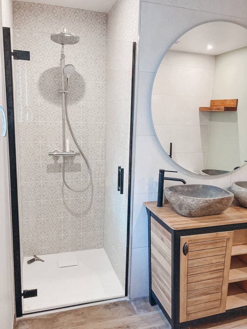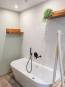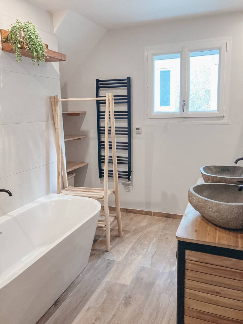 Initialement en forme de T avec un couloir, une baignoire de 140cm de longueur seulement et un petit meuble vasque, nous avons récupérer de précieux m² dans la grande chambre attenante pour créer une salle de bain familiale avec une baignoire semi-ilôt, une douche et une double vasque.