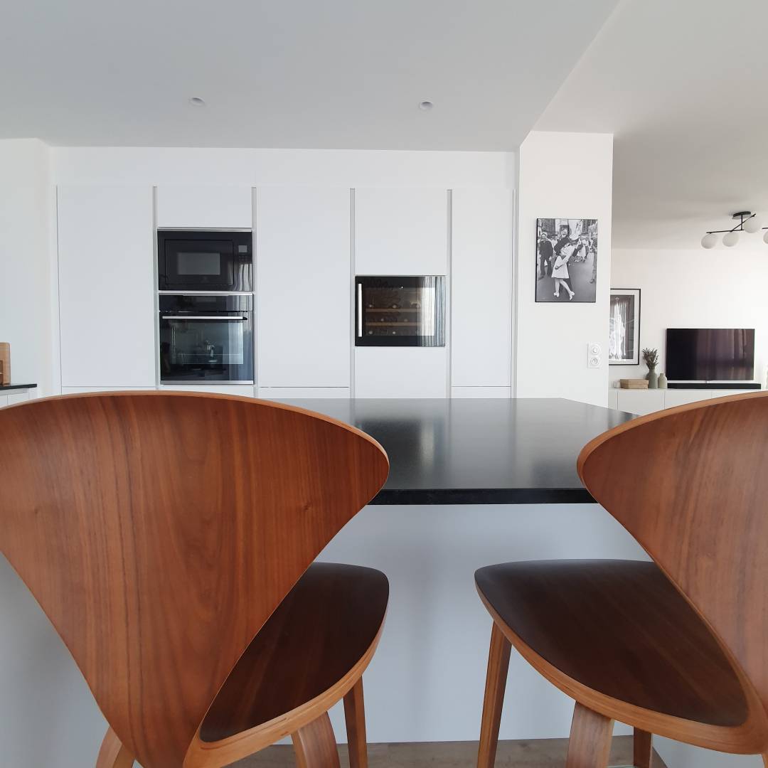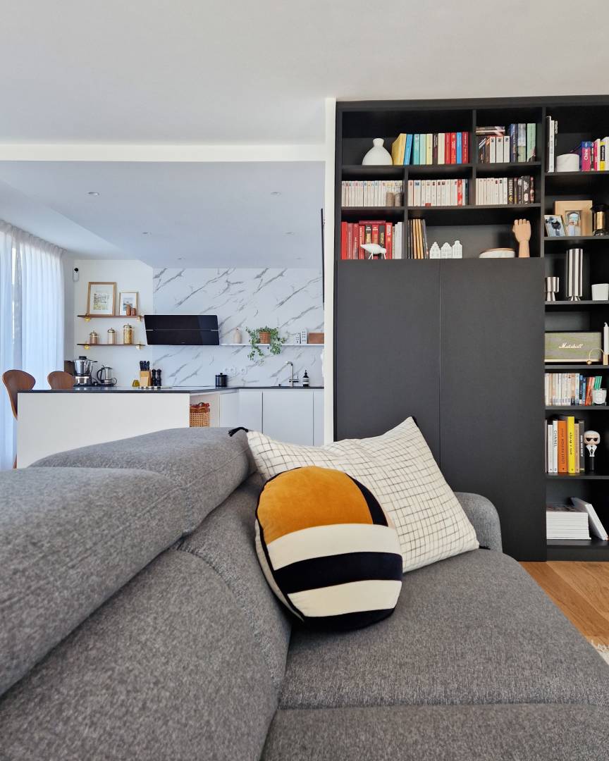 Aménagement complet d'un appartement en VEFA (Vente en État Futur d'Achèvement) de 105 m².   Modification du plan initial pour optimiser l'appartement Conception de la cuisine et des salles de bain Création d'un bureau/bibliothèque dans le salon et d'un dressing dans la chambre parentale Choix des matériaux et de la décoration (papiers peints, mobiliers, luminaires...)