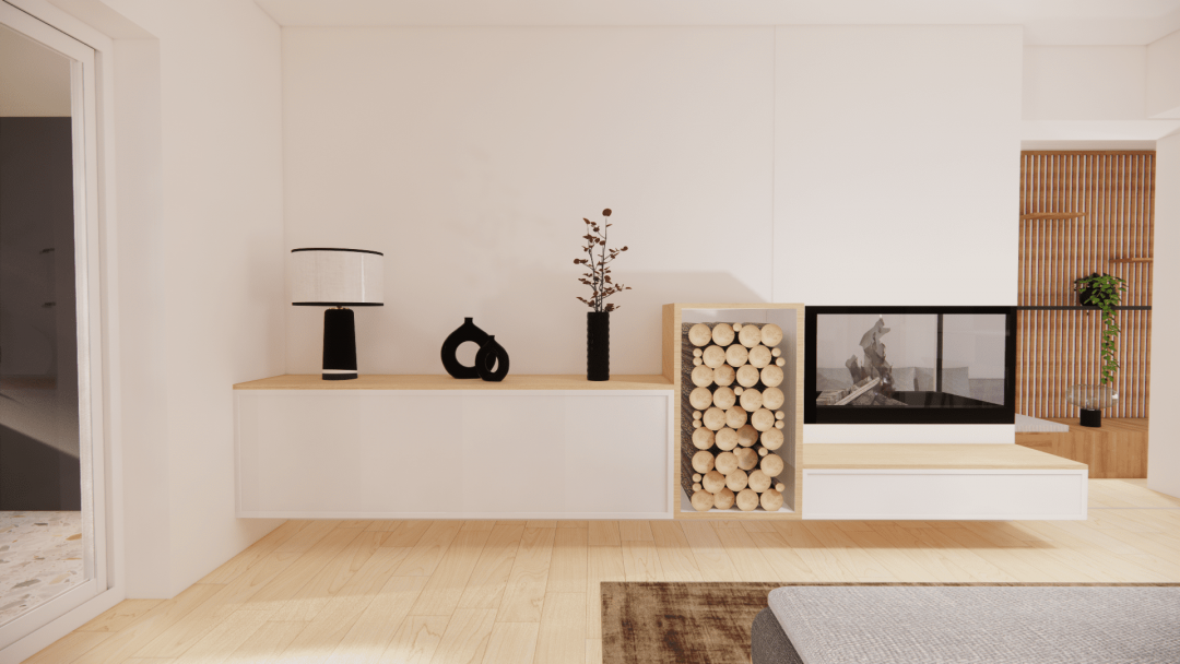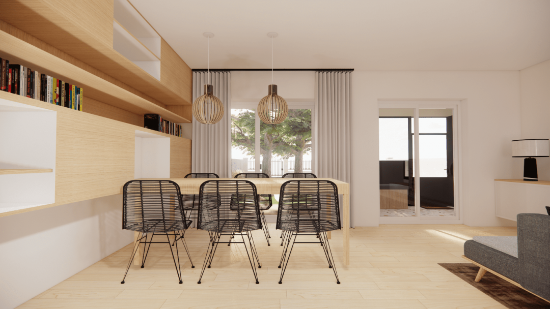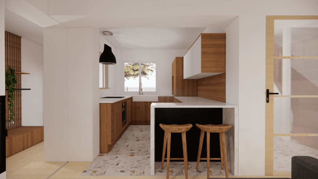 L'objectif de la rénovation de cette maison ancienne était de repenser les pièces pour gagner de nouveaux volumes, optimiser l'espace et la rendre plus adaptée au mode de vie de mes clients. Une véranda a été ajoutée pour créer une entrée avec rangement et éviter une entrée directe par le salon. Nous avons aussi exploité une partie du garage pour y créer un espace détente-home cinéma avec un insert d'angle qui profitera aussi au salon principal. Pour gagner en luminosité et projeter son regard sur le jardin, une baie vitrée a naturellement trouvé sa place et remplacé une porte classique. La cuisine a été optimisée de façon à y intégrer un coin repas et une verrière qui ouvre le regard sur l’espace détente en contrebas. Pour garantir un aménagement optimisé, le choix s’est porté sur la conception d’une bibliothèque suspendue avec une table intégrée qui a permis d’optimiser et de moderniser l’espace du salon. Pour apporter de la chaleur et du confort, nous avons aussi imaginé une banquette en L qui permet d'exploiter la longueur de l'espace. Pour le design et le côté fonctionnel, un habillage claustra et une partie basse pour déposer une lampe, un livre a été conçu dans la continuité de la banquette. Pour cette rénovation, nous avons privilégions des matériaux naturels et minéraux, comme le bois et le terrazzo.